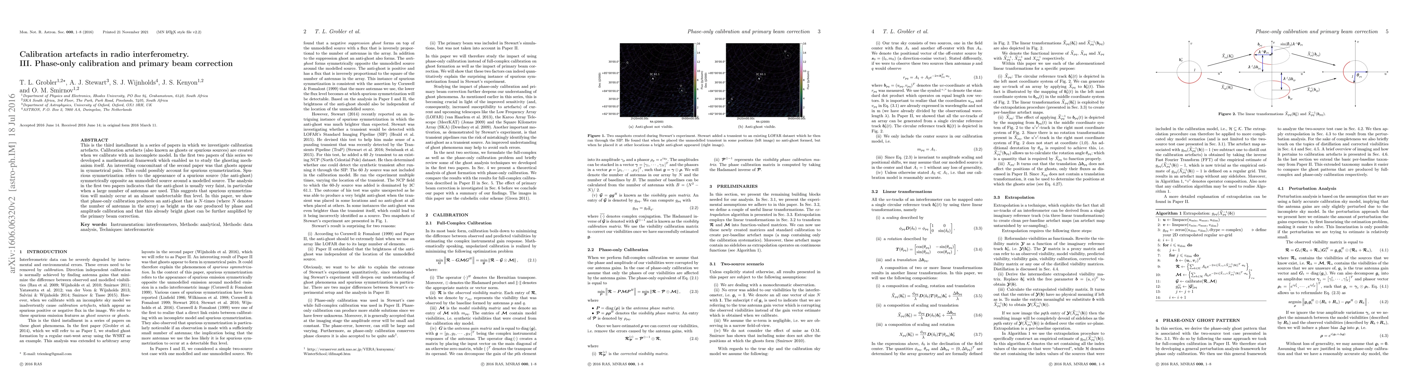 This is the third installment in a series of papers in which we investigate calibration artefacts. Calibration artefacts (also known as ghosts or spurious sources) are created when we calibrate with an incomplete model. In the first two papers of this series we developed a mathematical framework which enabled us to study the ghosting mechanism itself. An interesting concomitant of the second paper was that ghosts appear in symmetrical pairs. This could possibly account for spurious symmetrization. Spurious symmetrization refers to the appearance of a spurious source (the anti-ghost) symmetrically opposite an unmodelled source around a modelled source. The analysis in the first two papers indicates that the anti-ghost is usually very faint, in particular when a large number of antennas are used. This suggests that spurious symmetrization will mainly occur at an almost undetectable flux level. In this paper, we show that phase-only calibration produces an anti-ghost that is $N$-times (where $N$ denotes the number of antennas in the array) as bright as the one produced by phase and amplitude calibration and that this already bright ghost can be further amplified by the primary beam correction.