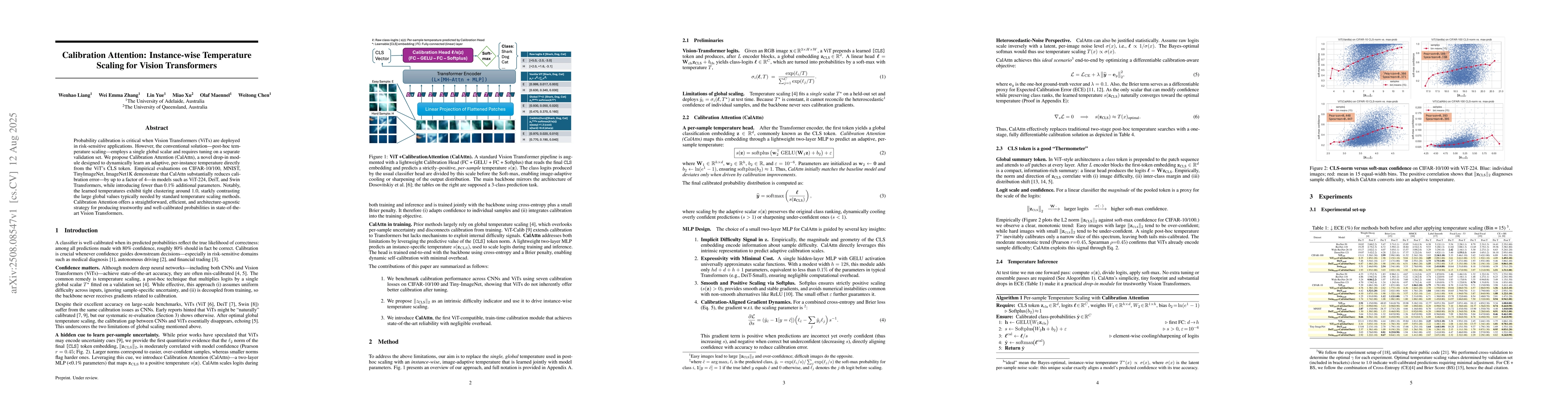 Probability calibration is critical when Vision Transformers are deployed in risk-sensitive applications. The standard fix, post-hoc temperature scaling, uses a single global scalar and requires a held-out validation set. We introduce Calibration Attention (CalAttn), a drop-in module that learns an adaptive, per-instance temperature directly from the ViT's CLS token. Across CIFAR-10/100, MNIST, Tiny-ImageNet, and ImageNet-1K, CalAttn reduces calibration error by up to 4x on ViT-224, DeiT, and Swin, while adding under 0.1 percent additional parameters. The learned temperatures cluster tightly around 1.0, in contrast to the large global values used by standard temperature scaling. CalAttn is simple, efficient, and architecture-agnostic, and yields more trustworthy probabilities without sacrificing accuracy. Code: [https://github.com/EagleAdelaide/CalibrationAttention-CalAttn-](https://github.com/EagleAdelaide/CalibrationAttention-CalAttn-)