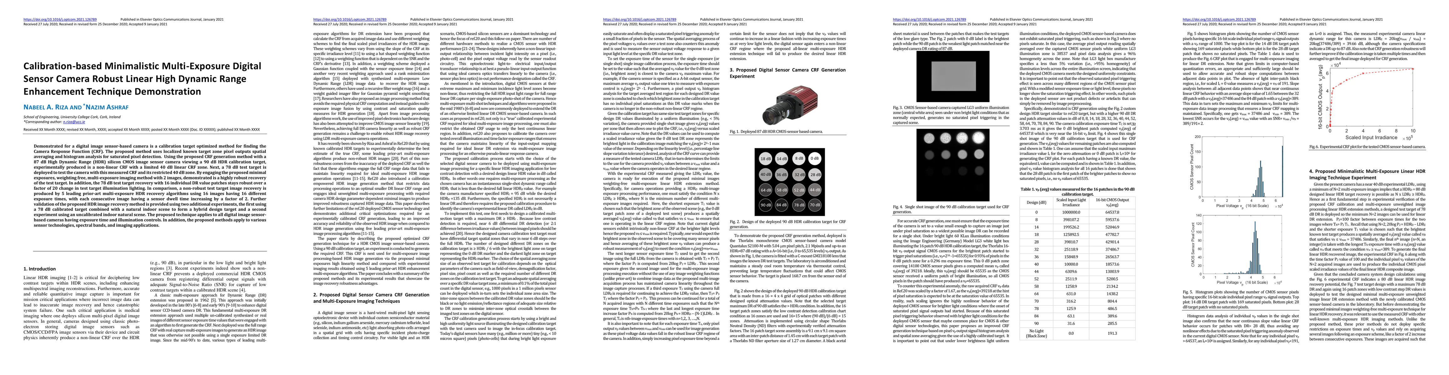 Demonstrated for a digital image sensor based camera is a calibration target optimized method for finding the Camera Response Function (CRF). The proposed method uses localized known target zone pixel outputs spatial averaging and histogram analysis for saturated pixel detection. Using the proposed CRF generation method with a 87 dB High Dynamic Range (HDR) silicon CMOS image sensor camera viewing a 90 dB HDR calibration target, experimentally produced is a non-linear CRF with a limited 40 dB linear CRF zone. Next, a 78 dB test target is deployed to test the camera with this measured CRF and its restricted 40 dB zone. By engaging the proposed minimal exposures, weighting free, multi-exposure imaging method with 2 images, demonstrated is a highly robust recovery of the test target. In addition, the 78 dB test target recovery with 16 individual DR value patches stays robust over a factor of 20 change in test target illumination lighting. In comparison, a non-robust test target image recovery is produced by 5 leading prior-art multi-exposure HDR recovery algorithms using 16 images having 16 different exposure times, with each consecutive image having a sensor dwell time increasing by a factor of 2. Further validation of the proposed HDR image recovery method is provided using two additional experiments, the first using a 78 dB calibrated target combined with a natural indoor scene to form a hybrid design target and a second experiment using an uncalibrated indoor natural scene. The proposed technique applies to all digital image sensor based cameras having exposure time and illumination controls. In addition, the proposed methods apply to various sensor technologies, spectral bands, and imaging applications.