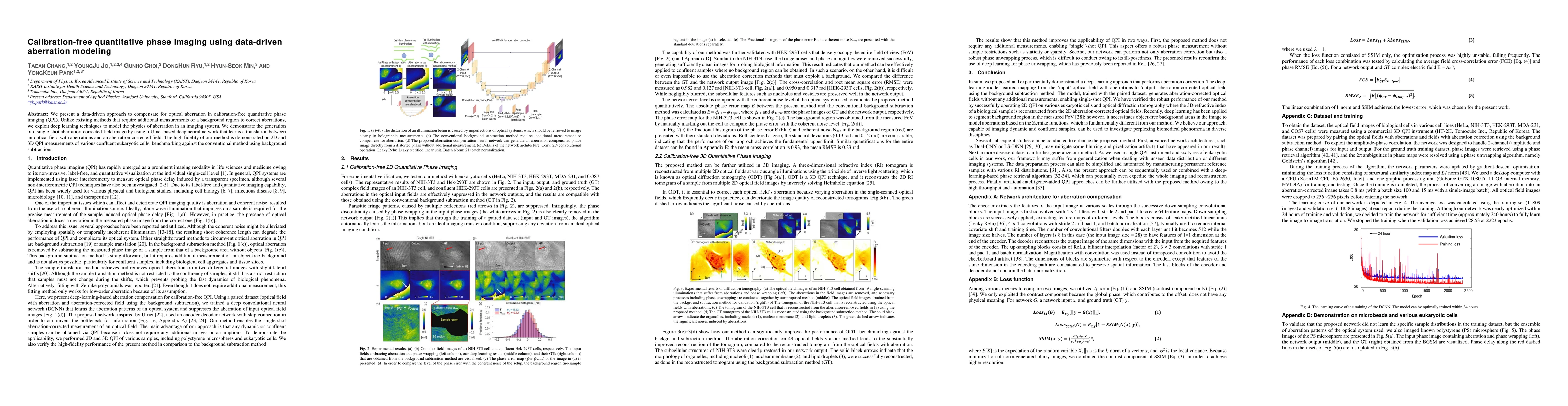 This paper introduces a data-driven deep learning method for calibration-free quantitative phase imaging that compensates for optical aberrations without requiring additional measurements. A U-net-based neural network models the aberration physics, enabling single-shot aberration correction and high-fidelity imaging of eukaryotic cells compared to conventional background subtraction methods.