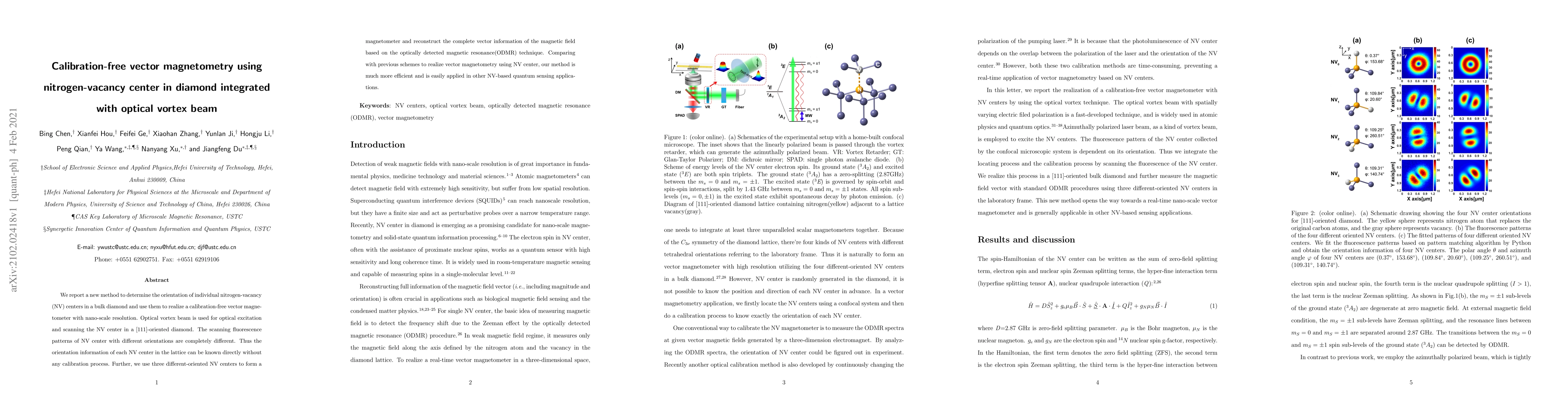 This paper introduces a calibration-free vector magnetometer using nitrogen-vacancy centers in diamond, integrated with optical vortex beams for nanoscale resolution. The method directly determines NV center orientations without calibration, enabling efficient and broadly applicable quantum sensing.