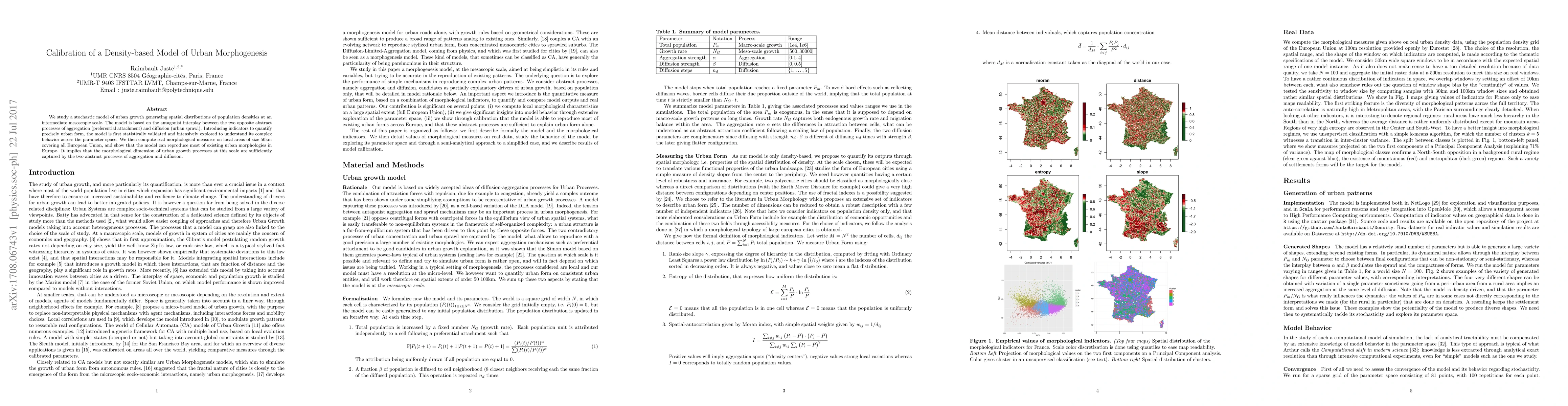 This paper calibrates a density-based stochastic model of urban growth that captures the interplay between aggregation and diffusion, validating it against European Union urban morphologies. The model successfully reproduces diverse urban forms across Europe, indicating that these two processes sufficiently explain urban morphogenesis at an intermediate scale.