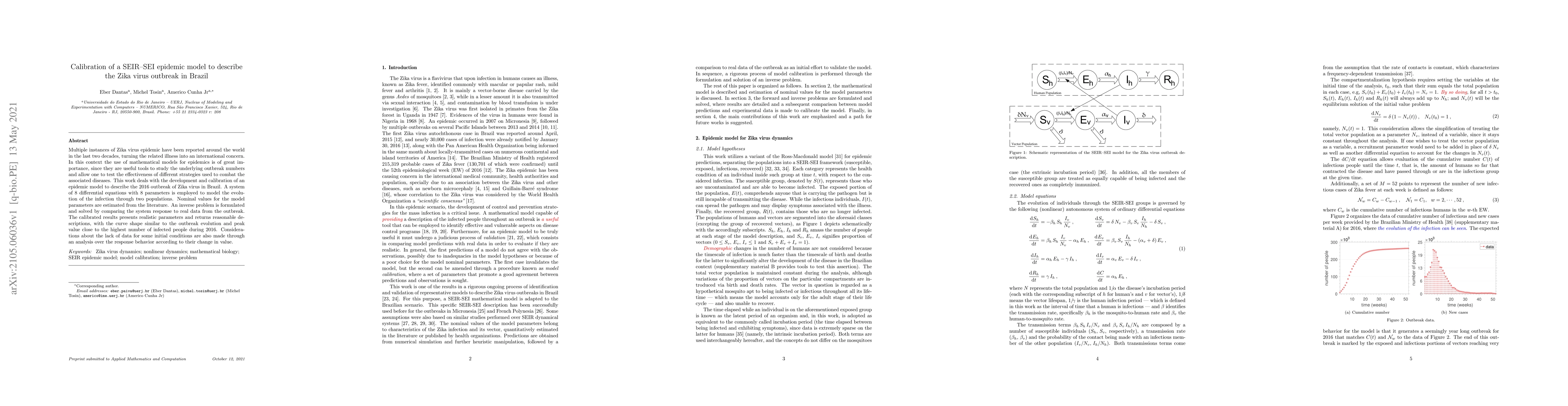 This paper develops and calibrates an SEIR-SEI model to describe the Zika virus outbreak in Brazil in 2016, using a system of differential equations to simulate infection dynamics. The calibrated model provides realistic parameters and accurately reflects the outbreak's peak and progression, though data limitations for initial conditions are acknowledged.