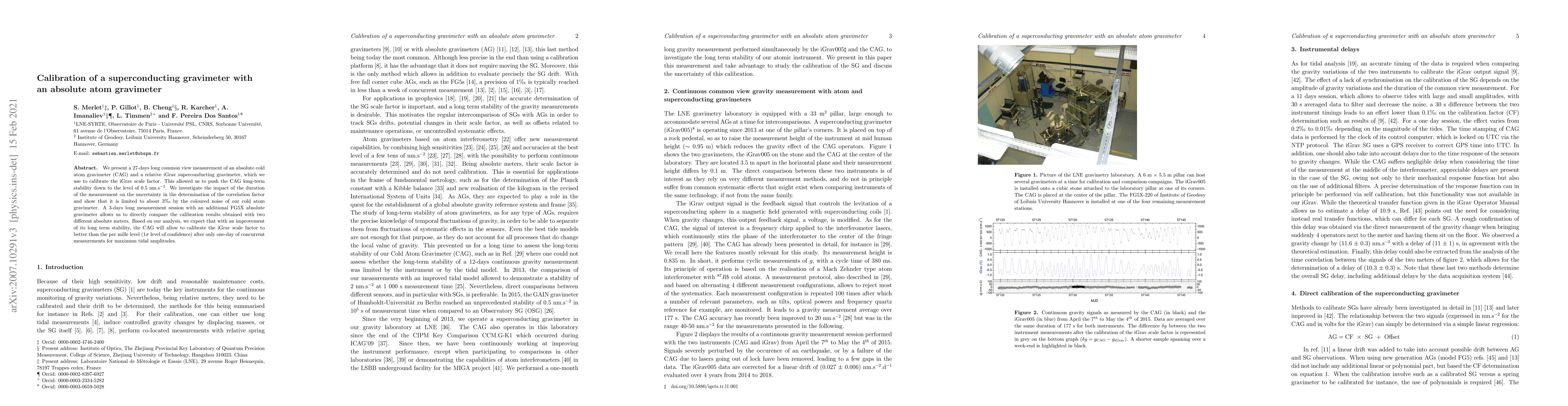 We present a 27-days long common view measurement of an absolute cold atom gravimeter (CAG) and a relative iGrav superconducting gravimeter, which we use to calibrate the iGrav scale factor. This allowed us to push the CAG long-term stability down to the level of 0.5~nm.s$^{-2}$. We investigate the impact of the duration of the measurement on the uncertainty in the determination of the correlation factor and show that it is limited to about 3\textperthousand~by the coloured noise of our cold atom gravimeter. A 3-days long measurement session with an additional FG5X absolute gravimeter allows us to directly compare the calibration results obtained with two different absolute meters. Based on our analysis, we expect that with an improvement of its long term stability, the CAG will allow to calibrate the iGrav scale factor to better than the per mille level (1$\sigma$ level of confidence) after only one-day of concurrent measurements for maximum tidal amplitudes.