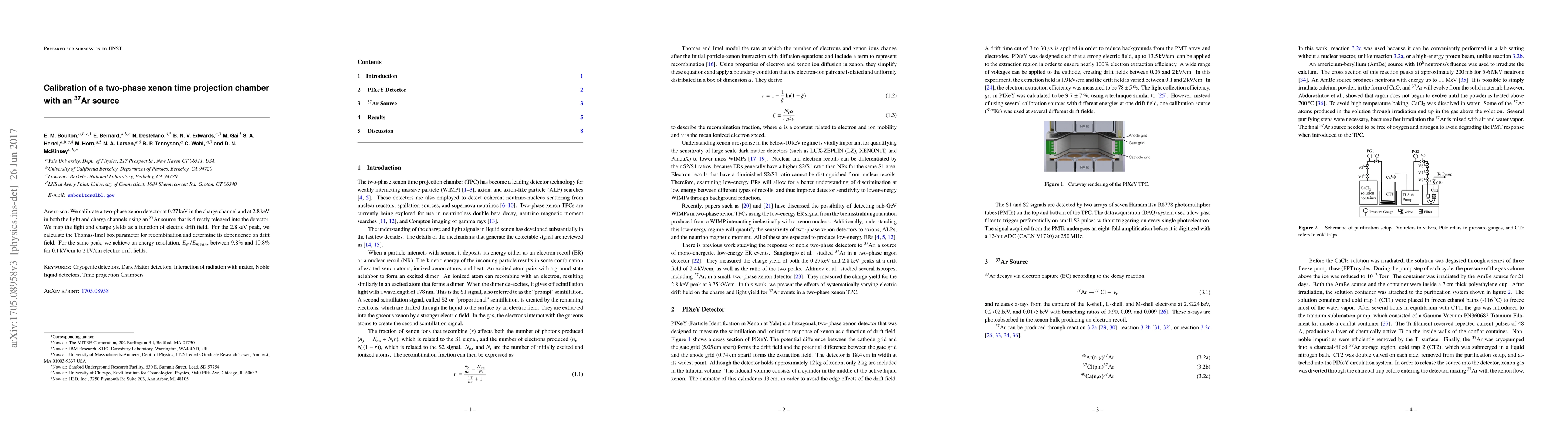 We calibrate a two-phase xenon detector at 0.27 keV in the charge channel and at 2.8 keV in both the light and charge channels using a $^{37}$Ar source that is directly released into the detector. We map the light and charge yields as a function of electric drift field. For the 2.8 keV peak, we calculate the Thomas-Imel box parameter for recombination and determine its dependence on drift field. For the same peak, we achieve an energy resolution, $E_{\sigma}/E_{mean}$, between 9.8% and 10.8% for 0.1 kV/cm to 2 kV/cm electric drift fields.