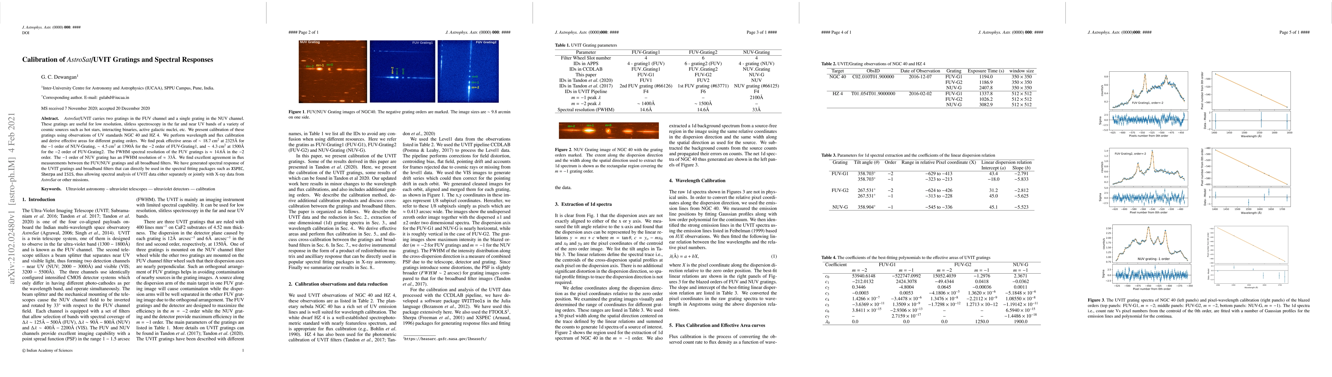 This paper details the calibration of AstroSat/UVIT gratings, focusing on wavelength and flux calibration using UV standards NGC40 and HZ4. The study derives effective areas and spectral resolutions for different grating orders, facilitating spectral analysis tools like XSPEC, Sherpa, and ISIS for combined UVIT and X-ray data.