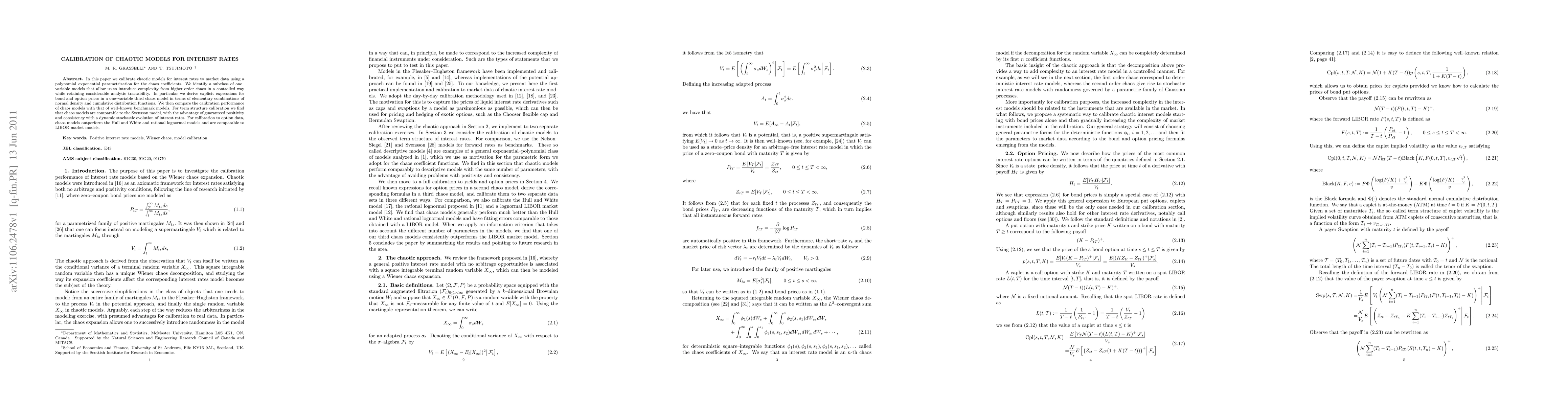 This paper calibrates chaotic models for interest rates using polynomial-exponential parametrization, deriving explicit expressions for bond and option prices in a third chaos model. It finds that chaos models are comparable to the Svensson model for term structure and outperform other benchmark models for option data.