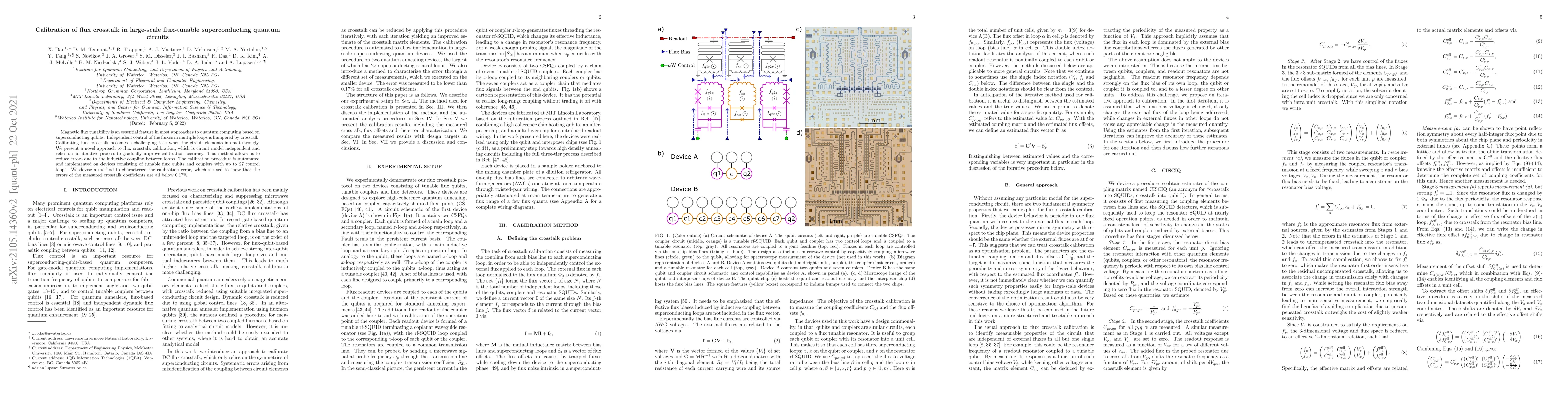 This paper presents a novel, circuit model-independent method for calibrating flux crosstalk in large-scale superconducting quantum circuits, reducing errors to below 0.17% through an iterative process and automated calibration procedure. The method is implemented on devices with up to 27 control loops.