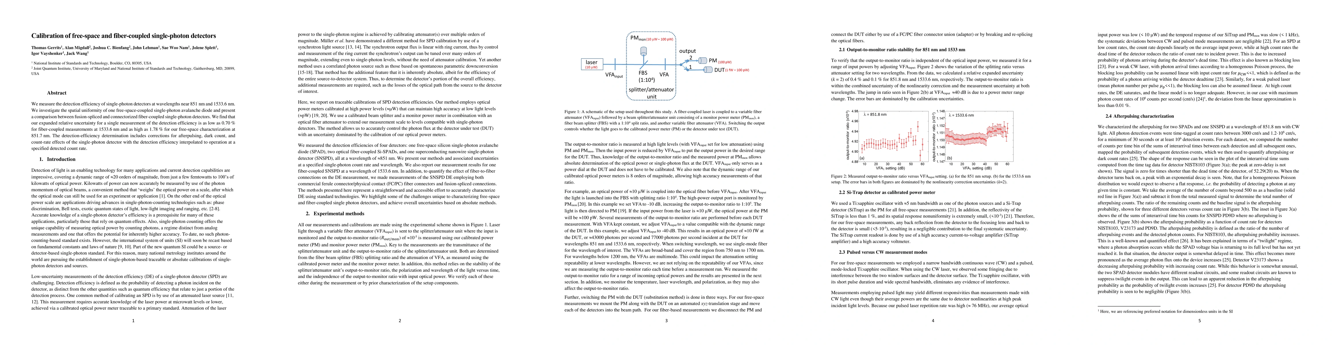This paper measures the detection efficiency of single-photon detectors at 851 nm and 1533.6 nm, comparing free-space and fiber-coupled configurations. The study finds a relative uncertainty as low as 0.70% for fiber-coupled detectors and up to 1.78% for free-space detectors, with comprehensive corrections for various detector effects.
