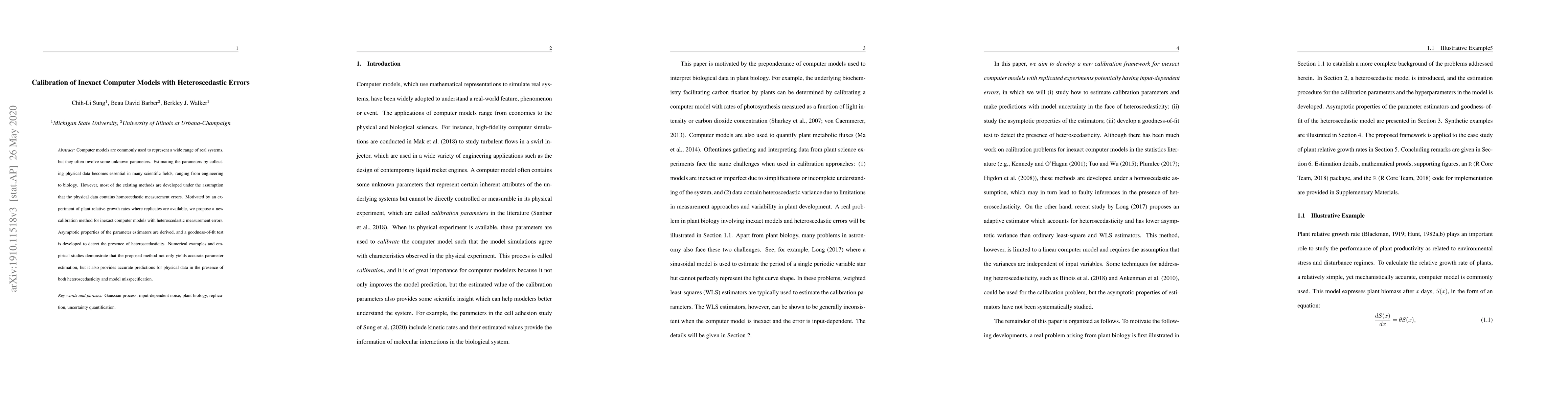 The paper proposes a calibration method for inexact computer models with heteroscedastic measurement errors, utilizing a latent variable process for error variance and an orthogonal Gaussian process for modeling model misspecification. It derives asymptotic properties of parameter estimators and develops a goodness-of-fit test for detecting heteroscedasticity.