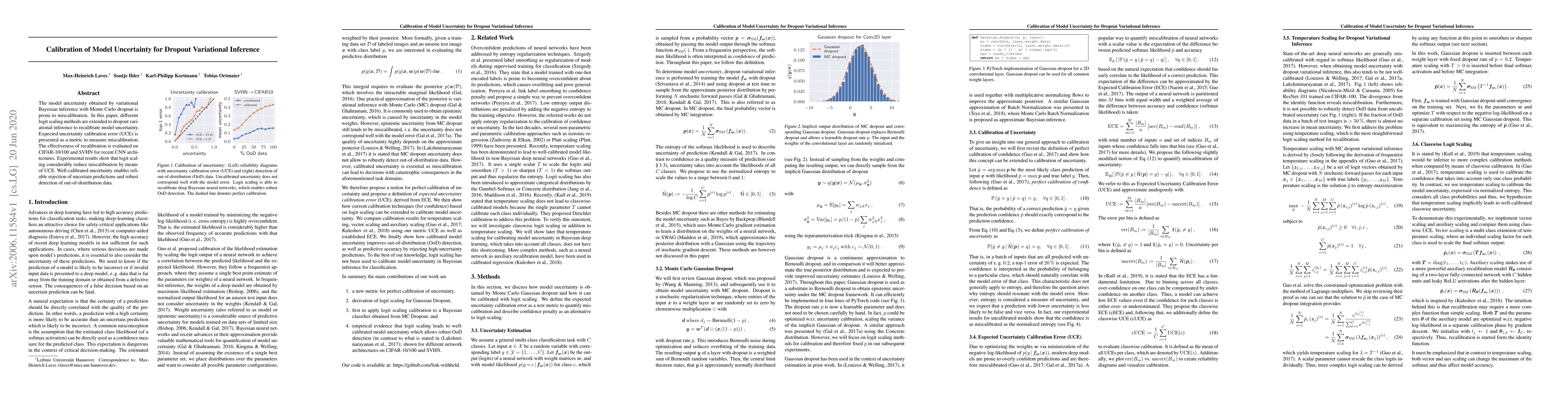 This paper recalibrates model uncertainty in dropout variational inference to improve its accuracy, reducing miscalibration on image classification tasks such as CIFAR-10/100 and SVHN.