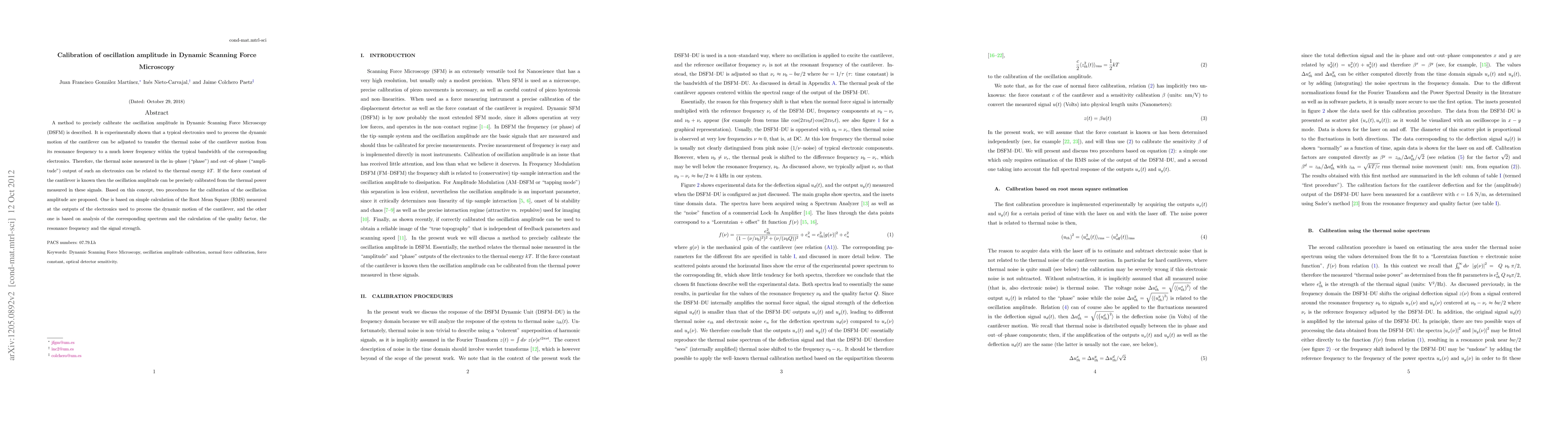 This paper presents a method to calibrate the oscillation amplitude in Dynamic Scanning Force Microscopy by adjusting electronics to shift the thermal noise of the cantilever to a lower frequency, enabling precise calibration from thermal power measurements. Two calibration procedures are proposed: one based on RMS calculation and the other on spectral analysis of the quality factor, resonance frequency, and signal strength.