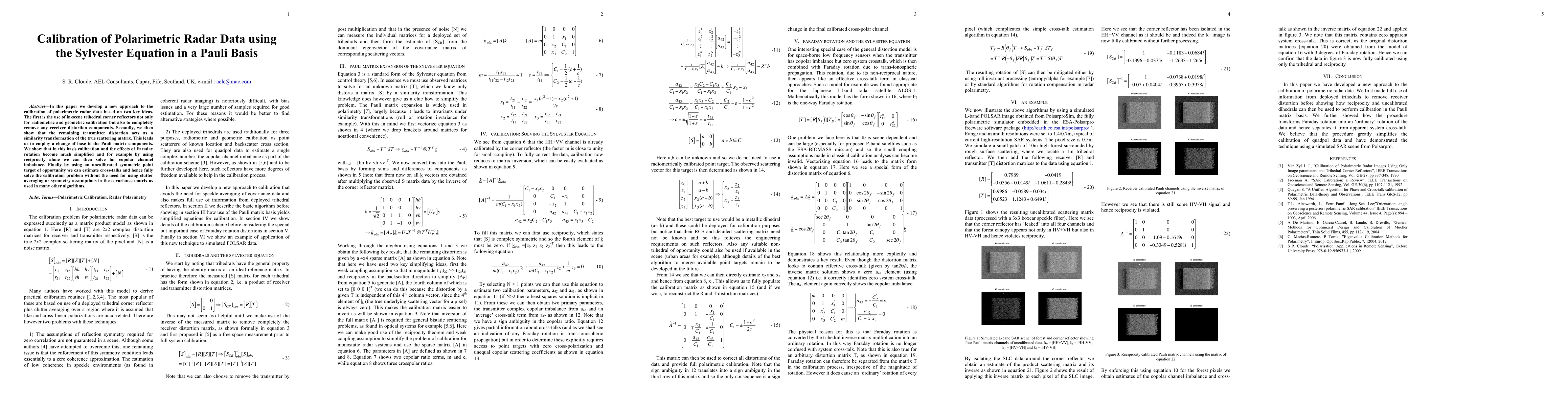 In this paper we develop a new approach to the calibration of polarimetric radar data based on two key ideas. The first is the use of in-scene trihedral corner reflectors not only for radiometric and geometric calibration but also to completely remove any receiver distortion components. Secondly, we then show that the remaining transmitter distortion acts as a similarity transformation of the true scattering matrix. This leads us to employ a change of base to the Pauli matrix components. We show that in this basis calibration and the effects of Faraday rotation become much simplified and for example by using reciprocity alone we can then solve for copolar channel imbalance. Finally by using an uncalibrated symmetric point target of opportunity we can estimate cross-talks and hence fully solve the calibration problem without the need for using clutter averaging or symmetry assumptions in the covariance matrix as used in many other algorithms.