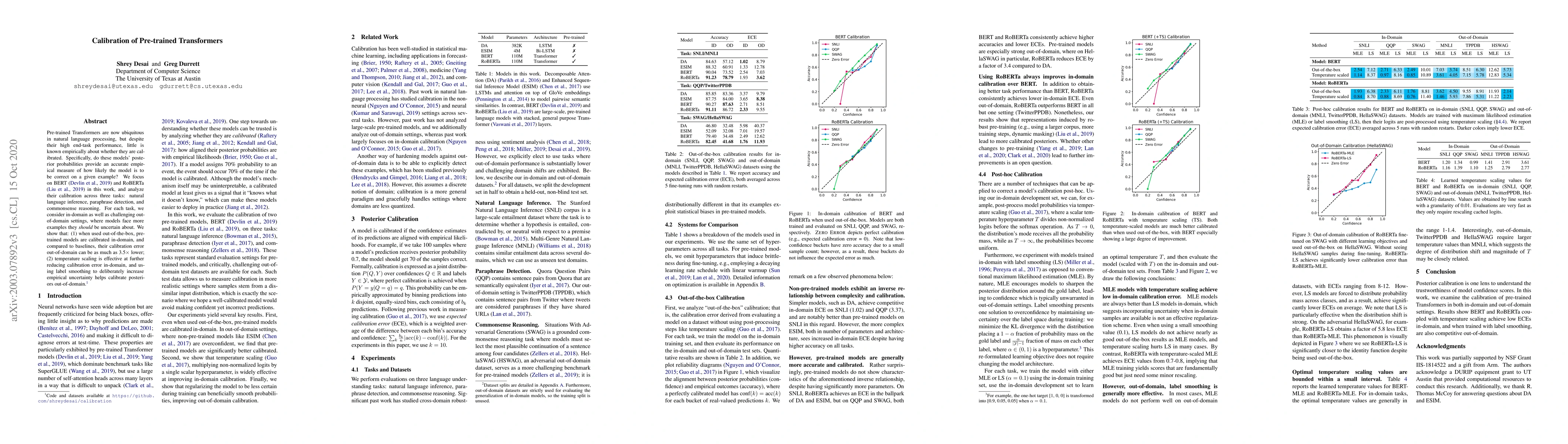 This paper investigates the calibration of pre-trained Transformers like BERT and RoBERTa across various NLP tasks, finding that they are well-calibrated in-domain but face calibration issues out-of-domain. Temperature scaling and label smoothing are shown to improve calibration, especially for out-of-domain examples.