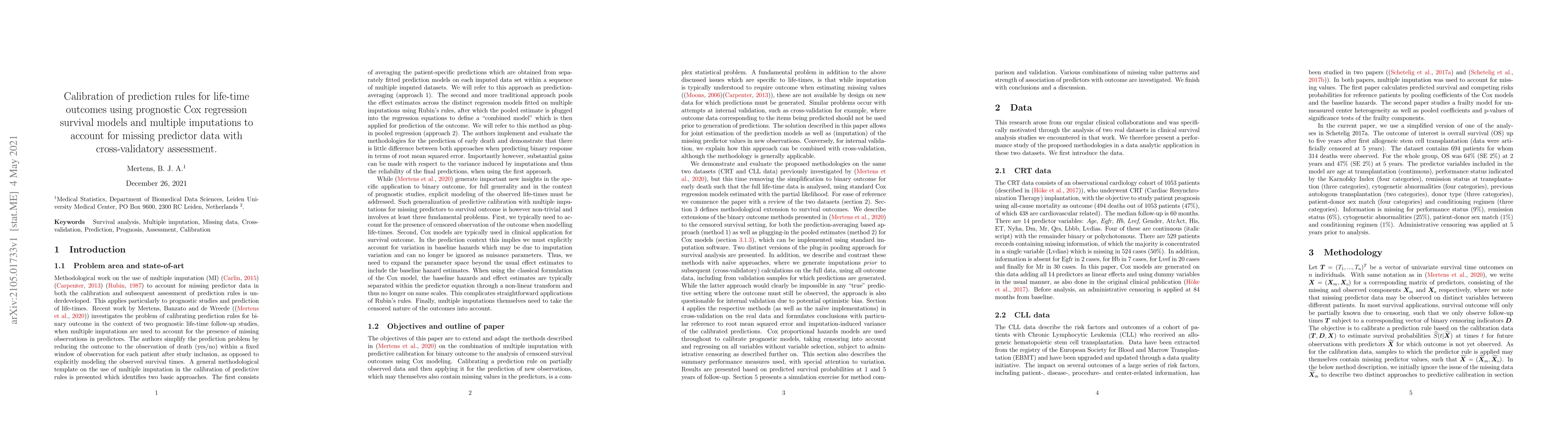This paper extends the methodology for calibrating prediction rules for survival outcomes using Cox regression models, incorporating multiple imputations to handle missing predictor data. It combines imputation with predictive calibration and applies cross-validation, demonstrating superior statistical properties of prediction-averaging over direct Rubin's rules application.