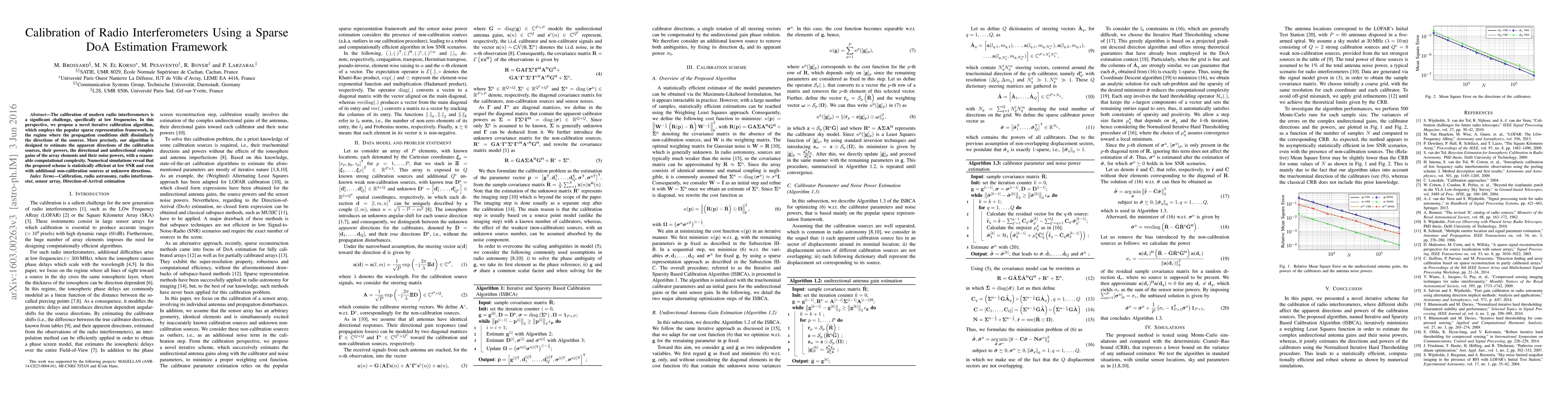 This paper proposes a novel iterative calibration algorithm for radio interferometers at low frequencies, utilizing a sparse direction-of-arrival (DoA) estimation framework. The algorithm estimates calibration source directions, powers, and array element gains with reasonable computational complexity, and simulations show its efficiency even at low SNR and with additional unknown sources.