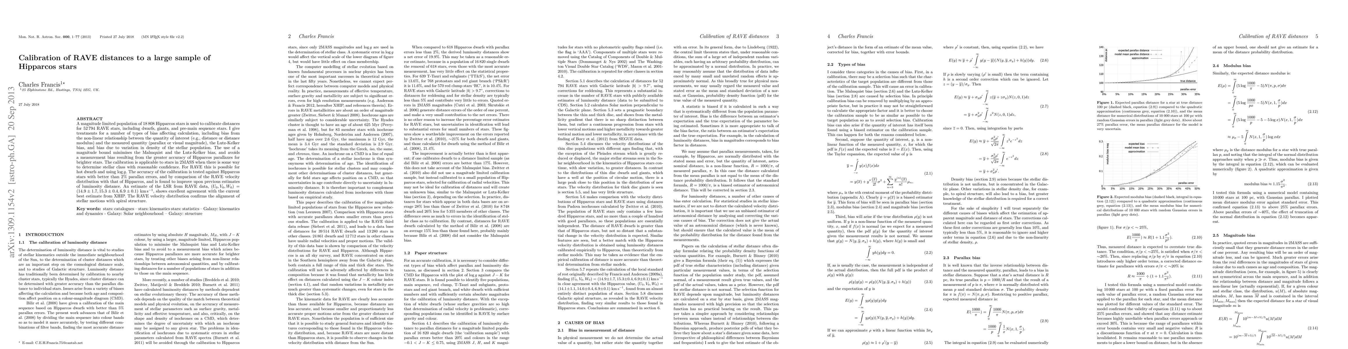 A magnitude limited population of 18 808 Hipparcos stars is used to calibrate distances for 52 794 RAVE stars, including dwarfs, giants, and pre-main sequence stars. I give treatments for a number of types of bias affecting calculation, including bias from the non-linear relationship between the quantity of interest (e.g., distance or distance modulus) and the measured quantity (parallax or visual magnitude), the Lutz-Kelker bias, and bias due to variation in density of the stellar population. The use of a magnitude bound minimises the Malmquist and the Lutz-Kelker bias, and avoids a measurement bias resulting from the greater accuracy of Hipparcos parallaxes for brighter stars. The calibration is applicable to stars in 2MASS when there is some way to determine stellar class with reasonable confidence. For RAVE this is possible for hot dwarfs and using $\log g $. The accuracy of the calibration is tested against Hipparcos stars with better than 2% parallax errors, and by comparison of the RAVE velocity distribution with that of Hipparcos, and is found to improve upon previous estimates of luminosity distance. An estimate of the LSR from RAVE data, (U_{0}, V_{0}, W_{0}) = (14.9 \pm 1.7, 15.3 \pm 0.4, 6.9 \pm 0.1) km\,s^{-1} shows excellent agreement with the current best estimate from XHIP. The RAVE velocity distribution confirms the alignment of stellar motions with spiral structure.