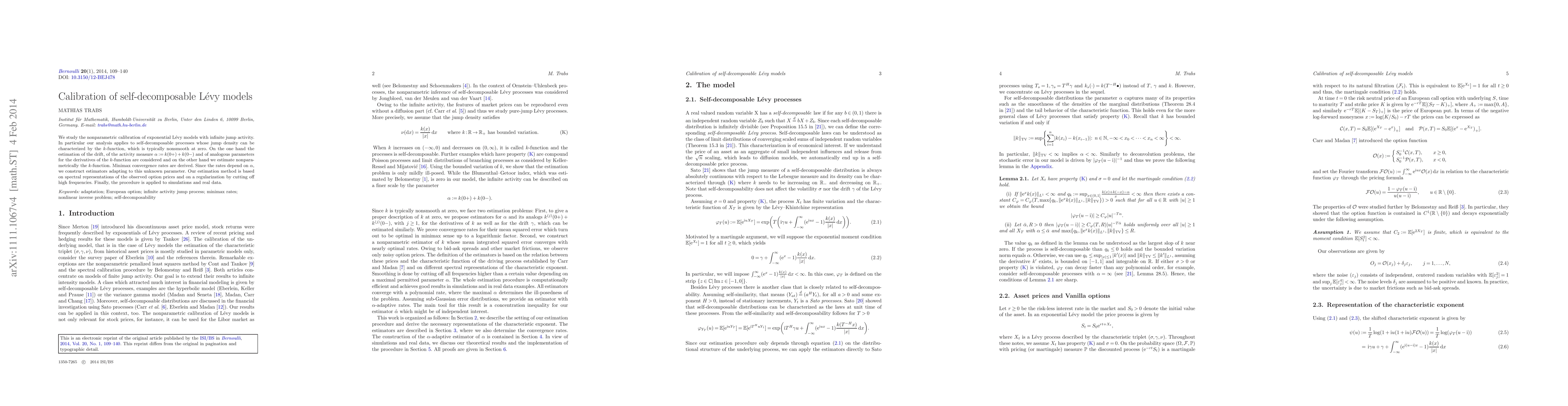 This research paper presents a method for calibrating self-decomposable Levy models using nonparametric estimation. It focuses on estimating drift, jump activity, and k-function parameters, deriving minimax convergence rates. The approach involves spectral representations of option prices and high-frequency regularization. The method adapts to the unknown jump activity parameter, alpha, and is tested on simulations and real data.