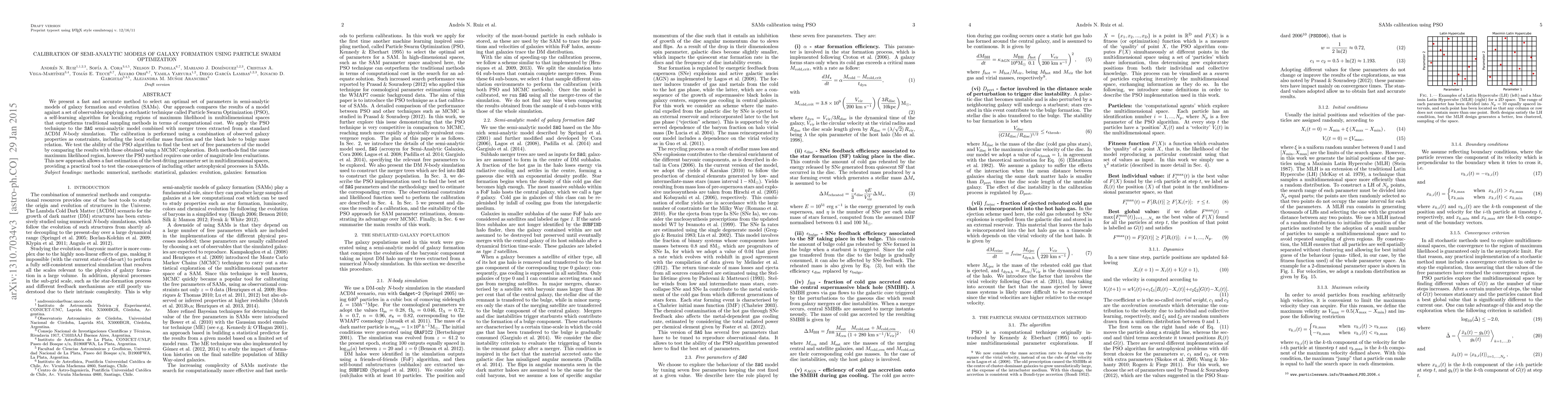 This paper presents a Particle Swarm Optimization (PSO) method for calibrating semi-analytic models of galaxy formation, achieving optimal parameter sets faster than traditional MCMC methods. The PSO technique, applied to the SAG model, requires an order of magnitude fewer evaluations while matching results from MCMC, offering a practical tool for exploring additional astrophysical processes.