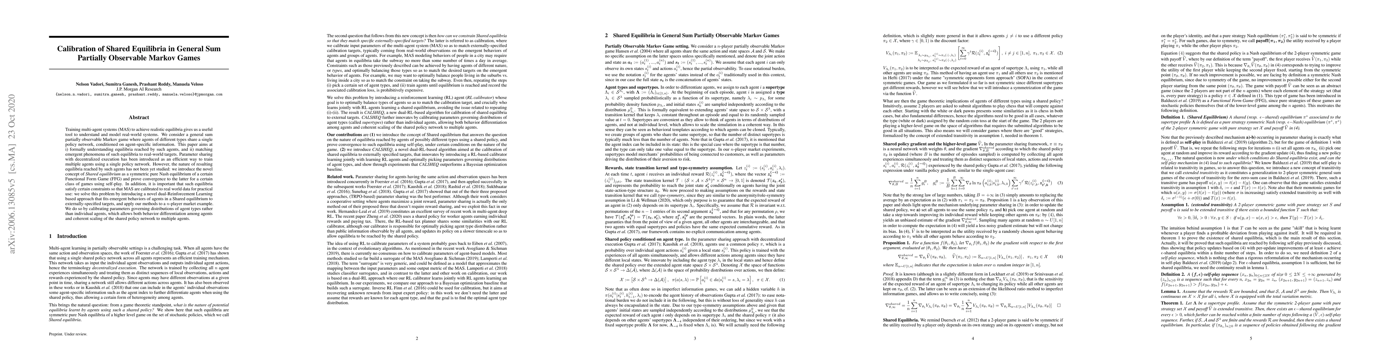 Training multi-agent systems (MAS) to achieve realistic equilibria gives us a useful tool to understand and model real-world systems. We consider a general sum partially observable Markov game where agents of different types share a single policy network, conditioned on agent-specific information. This paper aims at i) formally understanding equilibria reached by such agents, and ii) matching emergent phenomena of such equilibria to real-world targets. Parameter sharing with decentralized execution has been introduced as an efficient way to train multiple agents using a single policy network. However, the nature of resulting equilibria reached by such agents has not been yet studied: we introduce the novel concept of Shared equilibrium as a symmetric pure Nash equilibrium of a certain Functional Form Game (FFG) and prove convergence to the latter for a certain class of games using self-play. In addition, it is important that such equilibria satisfy certain constraints so that MAS are calibrated to real world data for practical use: we solve this problem by introducing a novel dual-Reinforcement Learning based approach that fits emergent behaviors of agents in a Shared equilibrium to externally-specified targets, and apply our methods to a n-player market example. We do so by calibrating parameters governing distributions of agent types rather than individual agents, which allows both behavior differentiation among agents and coherent scaling of the shared policy network to multiple agents.