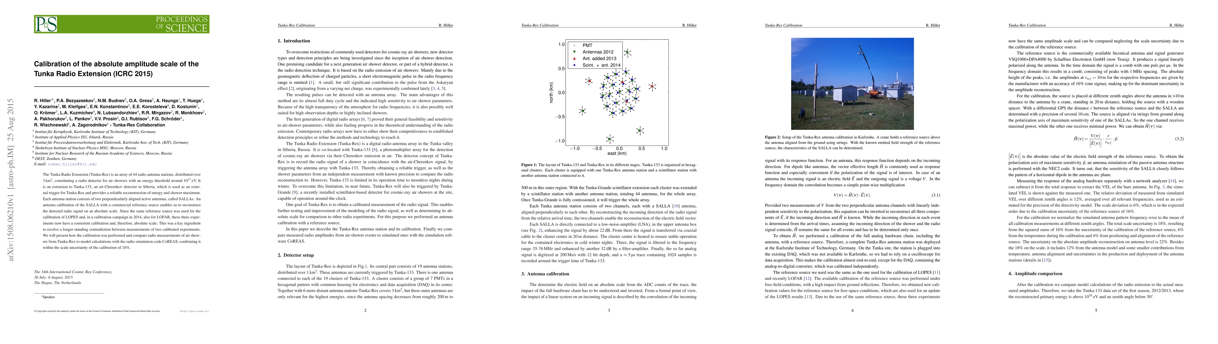 The Tunka Radio Extension (Tunka-Rex) is an array of 44 radio antenna stations, distributed over 3 km$^{2}$, constituting a radio detector for air showers with an energy threshold around 10$^{17}$ eV. It is an extension to Tunka-133, an air-Cherenkov detector in Siberia, which is used as an external trigger for Tunka-Rex and provides a reliable reconstruction of energy and shower maximum. Each antenna station consists of two perpendicularly aligned active antennas, called SALLAs. An antenna calibration of the SALLA with a commercial reference source enables us to reconstruct the detected radio signal on an absolute scale. Since the same reference source was used for the calibration of LOPES and, in a calibration campaign in 2014, also for LOFAR, these three experiments now have a consistent calibration and, therefore, absolute scale. This was a key ingredient to resolve a longer standing contradiction between measurements of two calibrated experiments. We will present how the calibration was performed and compare radio measurements of air showers from Tunka-Rex to model calculations with the radio simulation code CoREAS, confirming it within the scale uncertainty of the calibration of 18%.