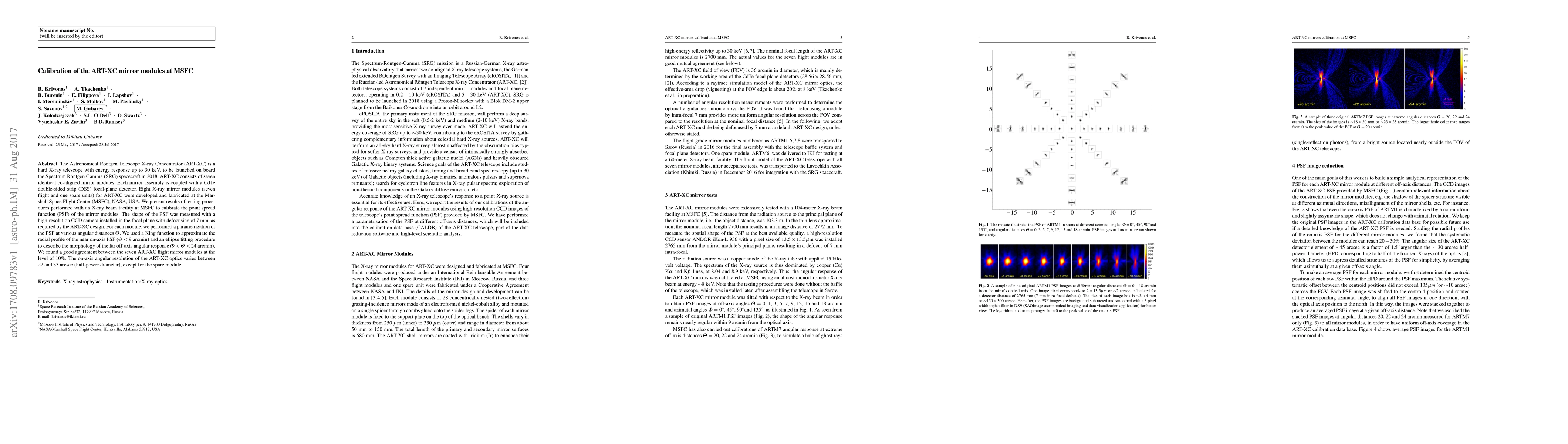 A team calibrated seven identical mirror modules for the ART-XC hard X-ray telescope, achieving 10% agreement among the modules, with an angular resolution of 27-33 arcseconds.