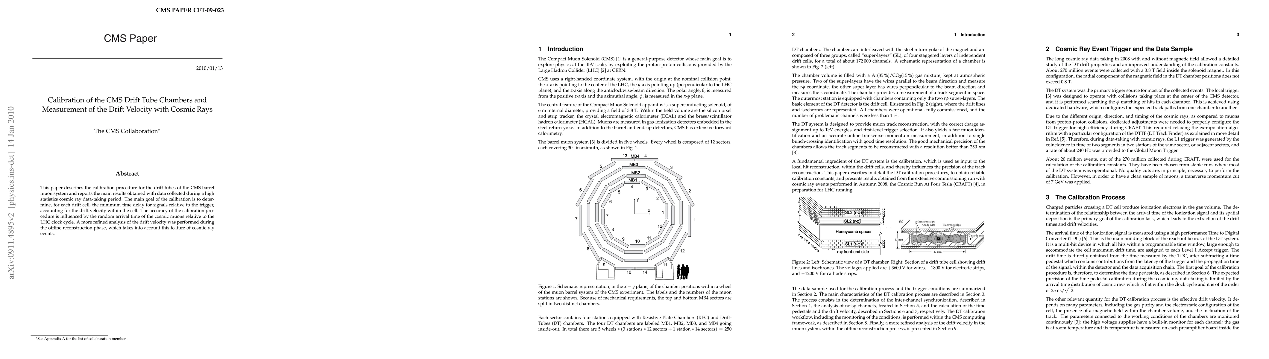 This paper details the calibration of CMS barrel muon system drift tubes using cosmic rays, focusing on determining the minimum time delay for signals relative to the trigger, and reports refined drift velocity measurements during the offline reconstruction phase. The calibration accuracy is affected by the random arrival time of cosmic muons relative to the LHC clock cycle.