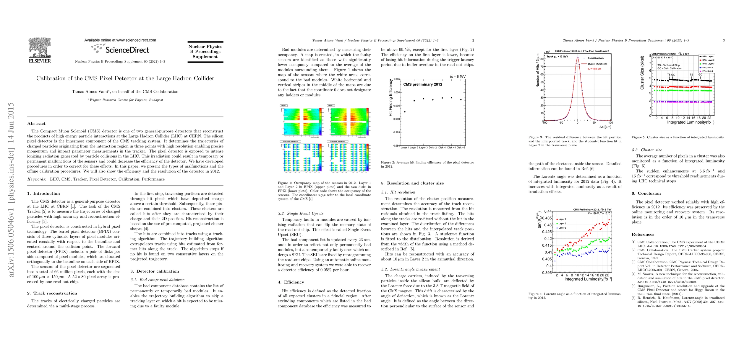 The Compact Muon Solenoid (CMS) detector is one of two general-purpose detectors that reconstruct the products of high energy particle interactions at the Large Hadron Collider (LHC) at CERN. The silicon pixel detector is the innermost component of the CMS tracking system. It determines the trajectories of charged particles originating from the interaction region in three points with high resolution enabling precise momentum and impact parameter measurements in the tracker. The pixel detector is exposed to intense ionizing radiation generated by particle collisions in the LHC. This irradiation could result in temporary or permanent malfunctions of the sensors and could decrease the efficiency of the detector. We have developed procedures in order to correct for these effects. In this paper, we present the types of malfunctions and the offline calibration procedures. We will also show the efficiency and the resolution of the detector in 2012.