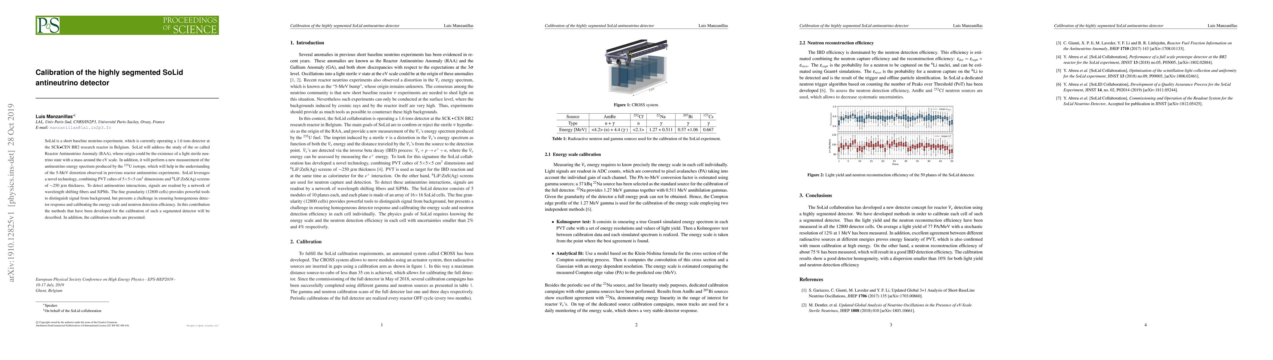 SoLid is a short baseline neutrino experiment, which is currently operating a 1.6 tons detector at the SCK$\bullet$CEN BR2 research reactor in Belgium. SoLid will address the study of the so called Reactor Antineutrino Anomaly (RAA), whose origin could be the existence of a light sterile neutrino state with a mass around the eV scale. In addition, it will perform a new measurement of the antineutrino energy spectrum produced by the $^{235}$U isotope, which will help in the understanding of the 5-MeV distortion observed in previous reactor antineutrino experiments. SoLid leverages a novel technology, combining PVT cubes of 5$\times$5$\times$5 cm$^{3}$ dimensions and $^{6}$LiF:ZnS(Ag) screens of $\sim$250 $\mu$m thickness. To detect antineutrino interactions, signals are readout by a network of wavelength shifting fibers and SiPMs. The fine granularity (12800 cells) provides powerful tools to distinguish signal from background, but presents a challenge in ensuring homogeneous detector response and calibrating the energy scale and neutron detection efficiency. In this contribution the methods that have been developed for the calibration of such a segmented detector will be described. In addition, the calibration results are presented.