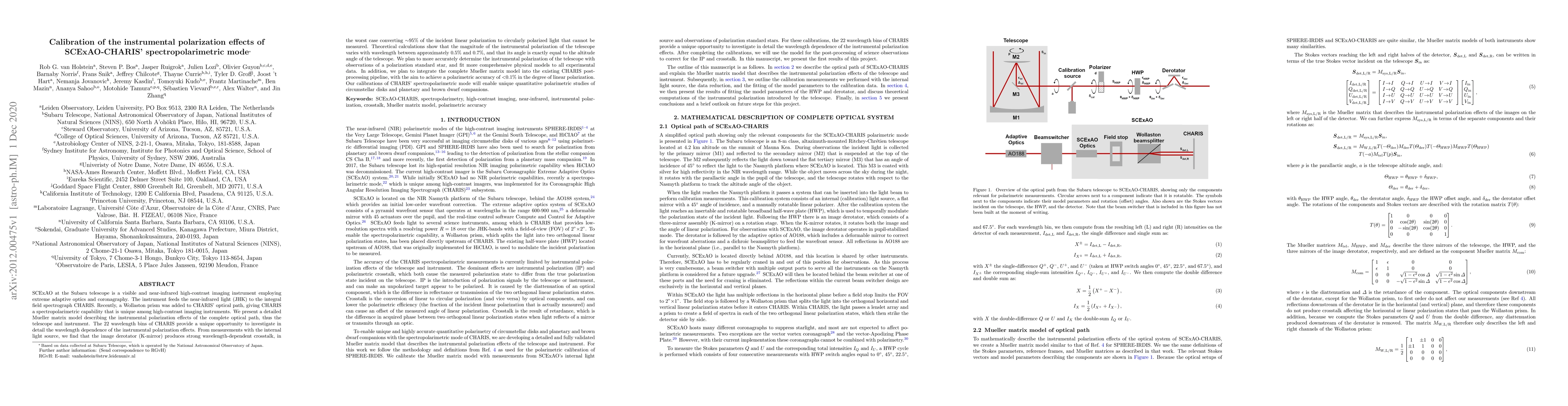 SCExAO at the Subaru telescope is a visible and near-infrared high-contrast imaging instrument employing extreme adaptive optics and coronagraphy. The instrument feeds the near-infrared light (JHK) to the integral field spectrograph CHARIS. Recently, a Wollaston prism was added to CHARIS' optical path, giving CHARIS a spectropolarimetric capability that is unique among high-contrast imaging instruments. We present a detailed Mueller matrix model describing the instrumental polarization effects of the complete optical path, thus the telescope and instrument. The 22 wavelength bins of CHARIS provide a unique opportunity to investigate in detail the wavelength dependence of the instrumental polarization effects. From measurements with the internal light source, we find that the image derotator (K-mirror) produces strong wavelength-dependent crosstalk, in the worst case converting ~95% of the incident linear polarization to circularly polarized light that cannot be measured. Theoretical calculations show that the magnitude of the instrumental polarization of the telescope varies with wavelength between approximately 0.5% and 0.7%, and that its angle is exactly equal to the altitude angle of the telescope. We plan to more accurately determine the instrumental polarization of the telescope with observations of a polarization standard star, and fit more comprehensive physical models to all experimental data. In addition, we plan to integrate the complete Mueller matrix model into the existing CHARIS post-processing pipeline, with the aim to achieve a polarimetric accuracy of <0.1% in the degree of linear polarization. Our calibrations of CHARIS' spectropolarimetric mode will enable unique quantitative polarimetric studies of circumstellar disks and planetary and brown dwarf companions.