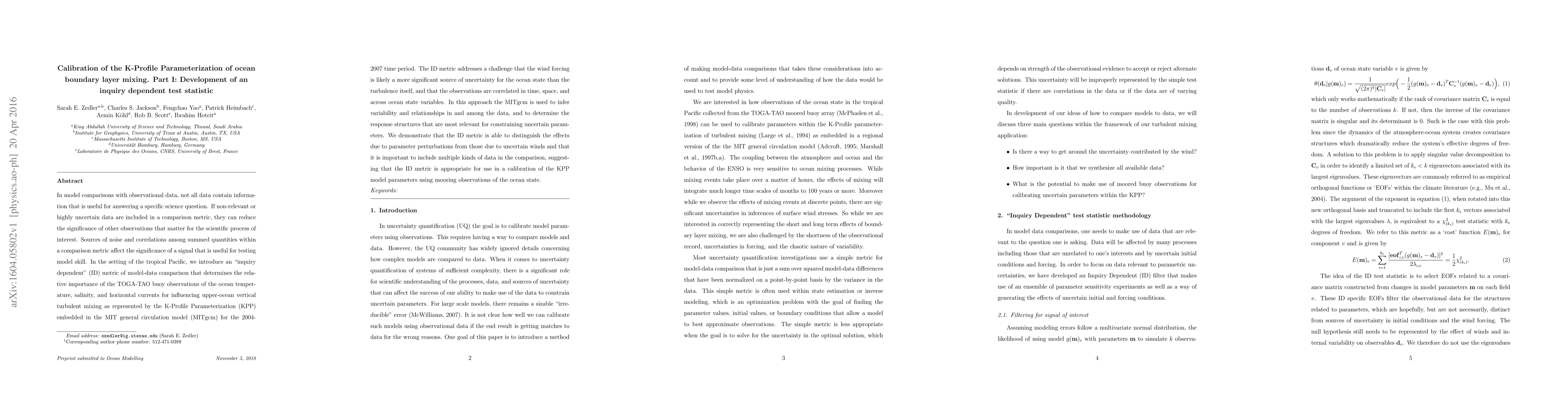 Researchers developed a new method to compare model data with observational data, focusing on ocean boundary layer mixing in the tropical Pacific. The approach helps distinguish between effects of parameter perturbations and uncertain winds on model outcomes.