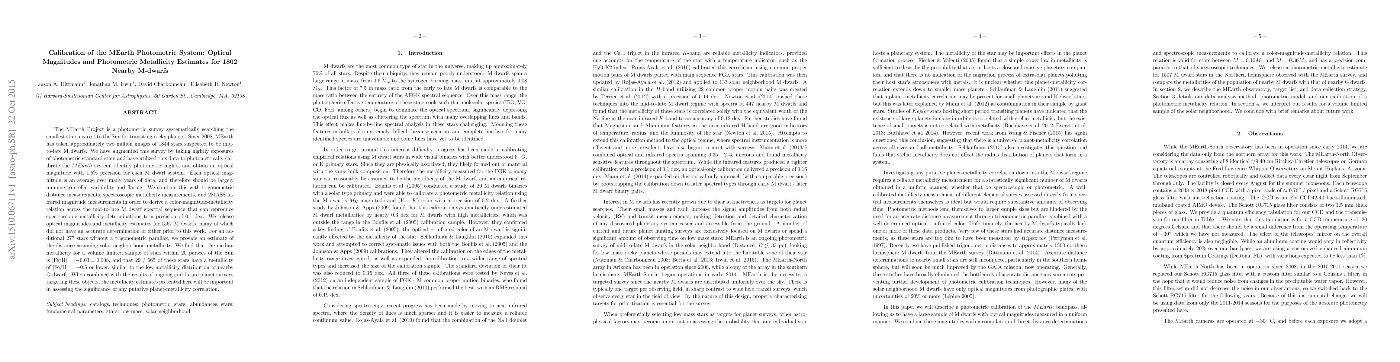 The MEarth Project has calibrated its photometric system to obtain precise optical magnitudes and metallicity estimates for 1802 nearby M-dwarfs, enhancing the search for transiting rocky planets. The derived color-magnitude-metallicity relation can reproduce spectroscopic metallicity determinations with 0.1 dex precision.