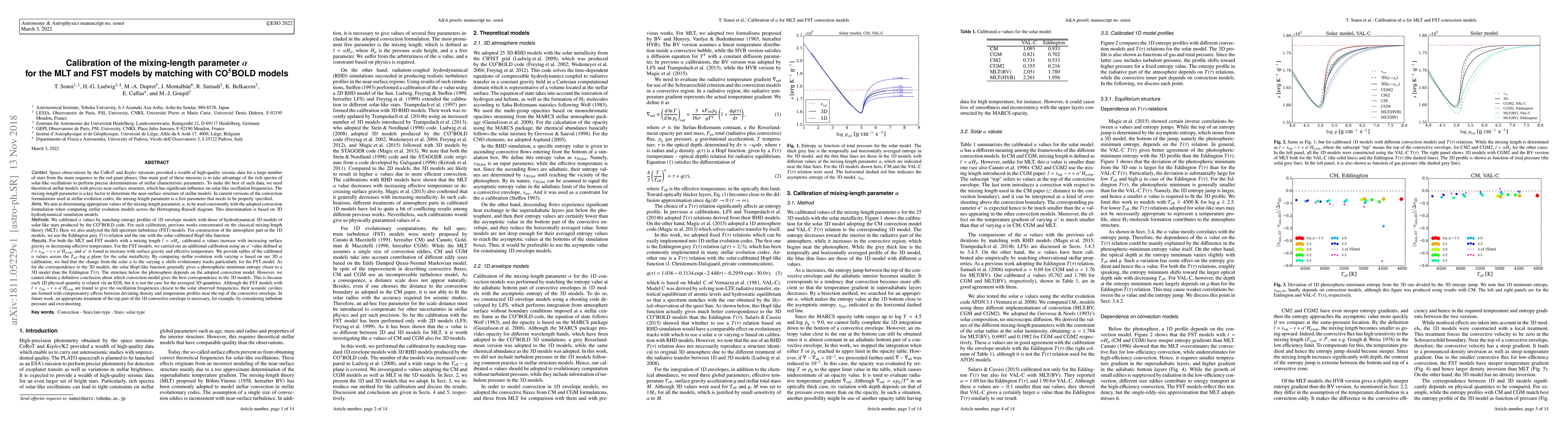 This paper calibrates the mixing-length parameter $\alpha$ for both the mixing-length theory (MLT) and full spectrum turbulence (FST) models by matching their entropy profiles with 3D CO$^5$BOLD models. The calibrated $\alpha$ values show a dependency on gravity and effective temperature, with $\alpha^*$ in FST models increasing with both parameters.