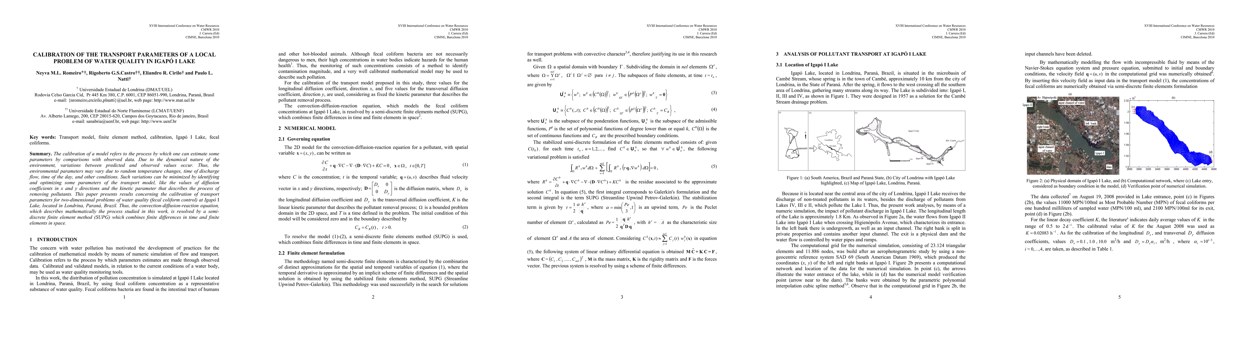 The calibration of a model refers to the process by which one can estimate some parameters by comparisons with observed data. Due to the dynamical nature of the environment, variations between predicted and observed values occur. Thus, the environmental parameters may vary due to random temperature changes, time of discharge flow, time of the day, and other conditions. Such variations can be minimized by identifying and optimizing some parameters of the transport model, like the values of diffusion coefficients in x and y directions and the kinetic parameter that describes the process of removing pollutants. This paper presents results concerning the calibration of transport parameters for two-dimensional problems of water quality (fecal coliform control) at Igap\'o I Lake, located in Londrina, Paran\'a, Brazil. Thus, the convection-diffusion-reaction equation, which describes mathematically the process studied in this work, is resolved by a semidiscrete finite element method (SUPG) which combines finite differences in time and finite elements in space.