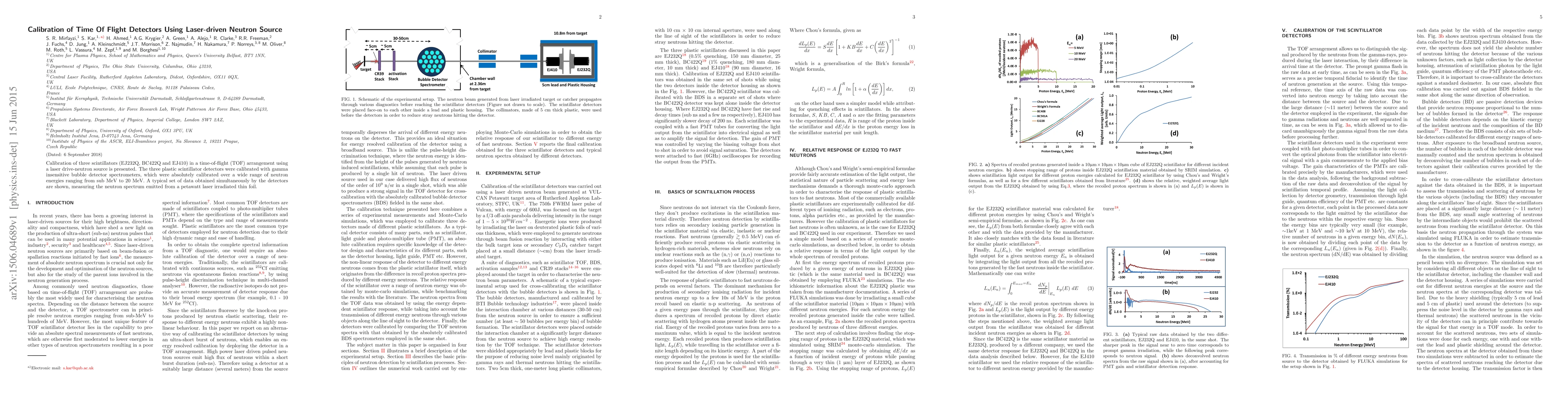 The paper presents a comprehensive calibration technique for plastic scintillator detectors using a laser-driven neutron source, combining experimental data with Monte Carlo simulations to determine the relative response of scintillators to fast neutrons.