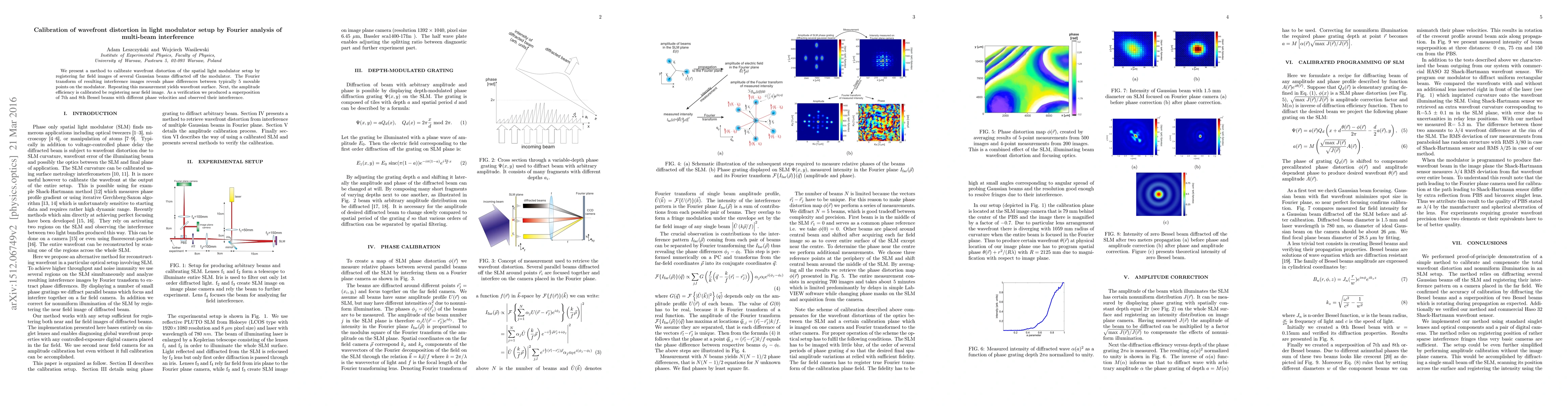 We present a method to calibrate wavefront distortion of the spatial light modulator setup by registering far field images of several Gaussian beams diffracted off the modulator. The Fourier transform of resulting interference images reveals phase differences between typically 5 movable points on the modulator. Repeating this measurement yields wavefront surface. Next, the amplitude efficiency is calibrated be registering near field image. As a verification we produced a superposition of 7th and 8th Bessel beams with different phase velocities and observed their interference.