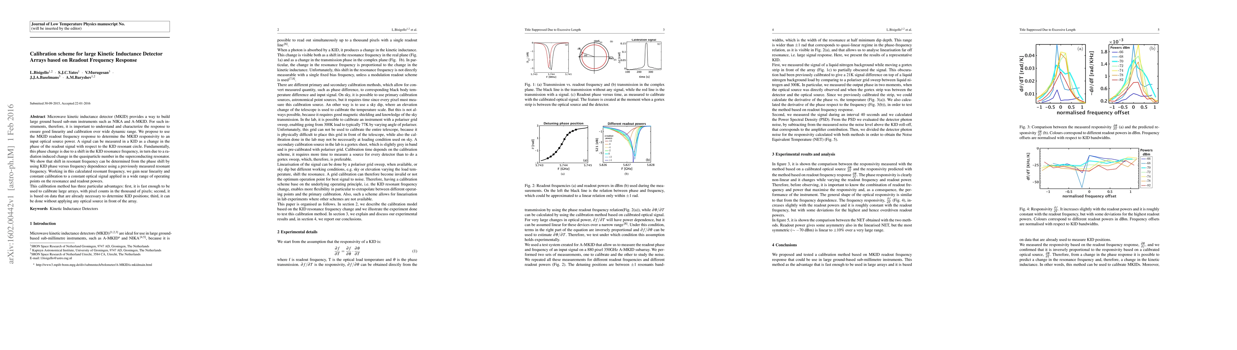 This paper proposes a calibration scheme for large Kinetic Inductance Detector (KID) arrays using the readout frequency response, achieving near linearity and constant calibration over a wide dynamic range. The method leverages the phase shift in the KID resonant frequency to determine responsivity without requiring an optical source, making it efficient for large arrays.