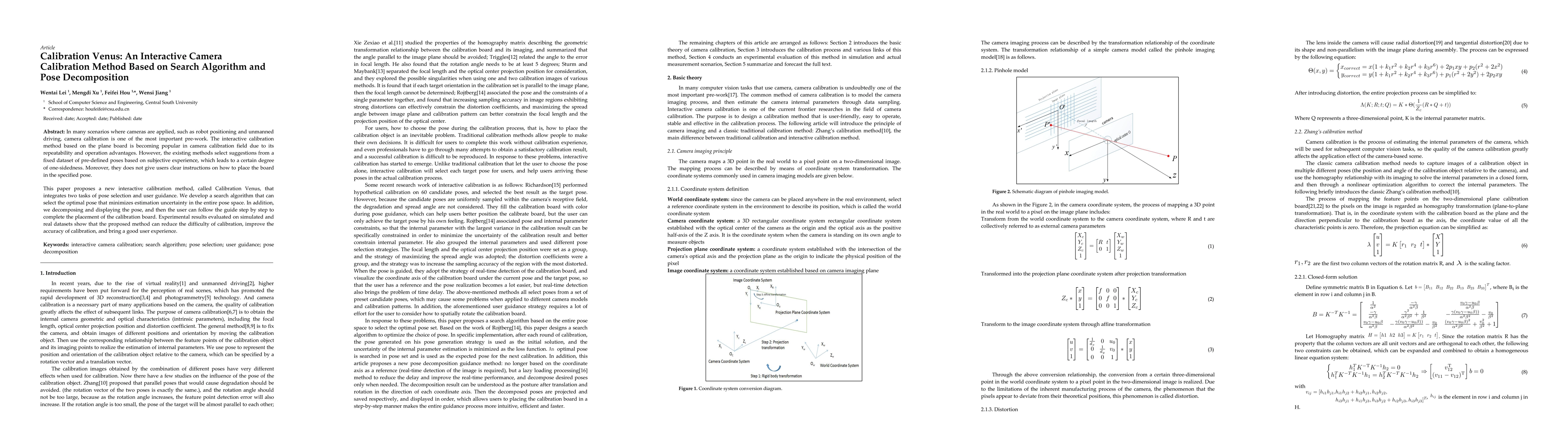 This paper proposes an interactive camera calibration method using a search algorithm and pose decomposition, aiming to improve calibration accuracy by reducing the reliance on subjective experience and providing clearer instructions for the user to position the calibration board. The method seeks to enhance repeatability and operational efficiency in applications like robot positioning and unmanned driving.