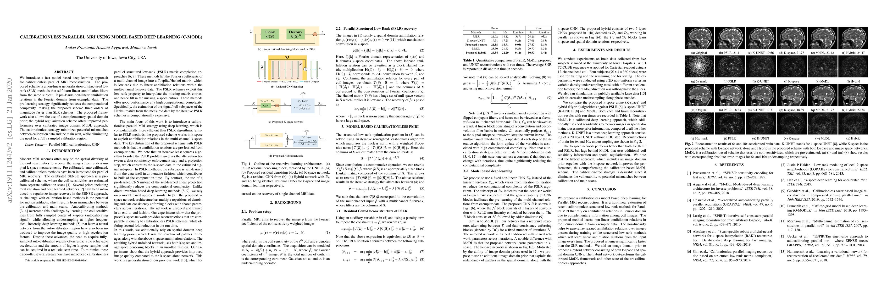 This paper proposes a fast, calibrationless parallel MRI reconstruction method using model-based deep learning, which generalizes structured low rank methods by self-learning annihilation filters. It significantly reduces computational complexity and improves performance compared to traditional calibrated approaches.