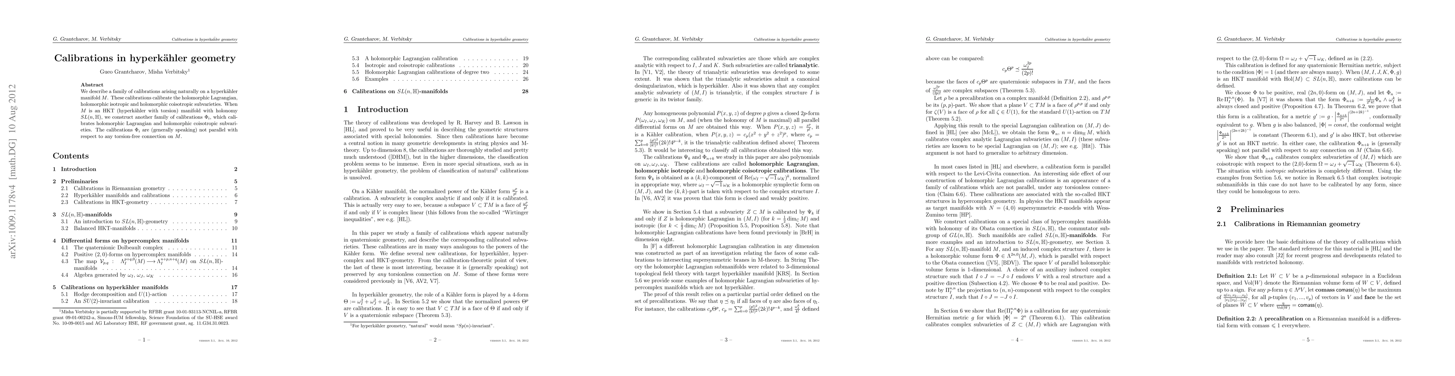 We describe a family of calibrations arising naturally on a hyperk\"ahler manifold $M$. These calibrations calibrate the holomorphic Lagrangian, holomorphic isotropic and holomorphic coisotropic subvarieties. When $M$ is an HKT (hyperkaehler with torsion) manifold with holonomy $SL(n, {\Bbb H})$, we construct another family of calibrations $\Phi_i$, which calibrates holomorphic Lagrangian and holomorphic coisotropic subvarieties. The calibrations $\Phi_i$ are (generally speaking) not parallel with respect to any torsion-free connection on $M$.