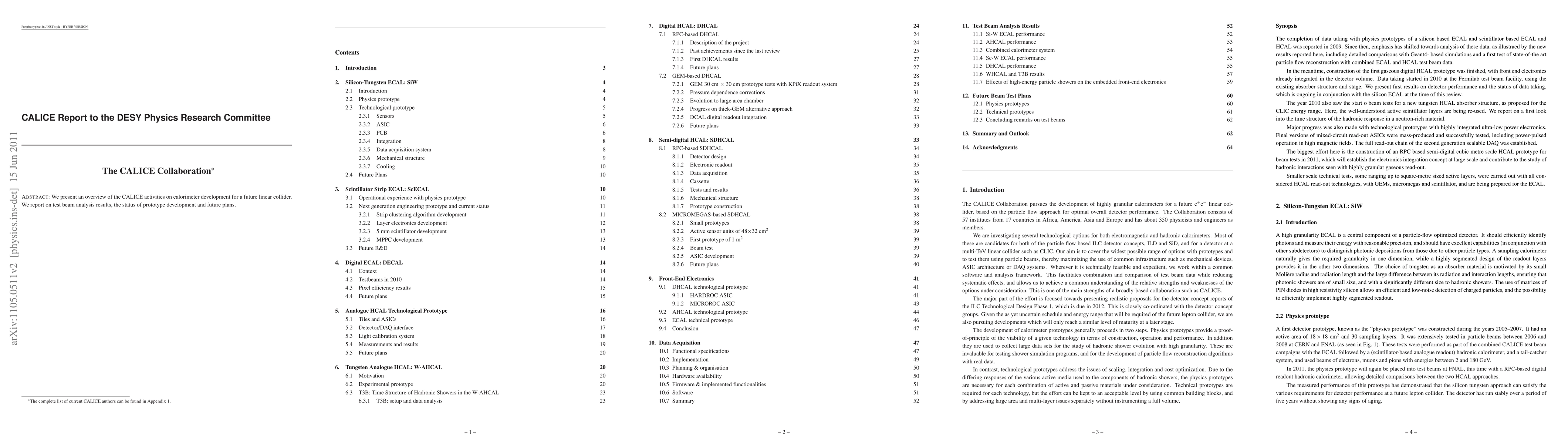 Summary: This report provides an overview of CALICE's efforts in developing calorimeters for a future linear collider, highlighting test beam analysis outcomes, the current status of prototype development, and future project plans.