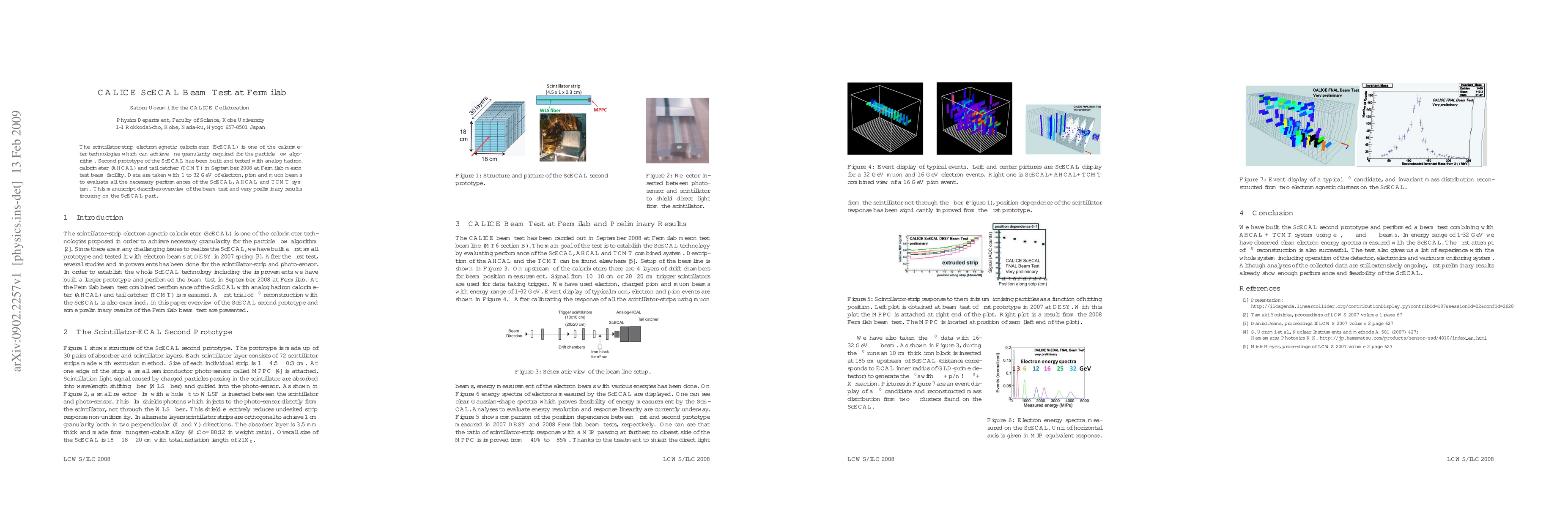 The CALICE ScECAL beam test at Fermilab evaluated a scintillator-strip electromagnetic calorimeter prototype using a meson test beam facility. Preliminary results from the test, conducted with electron, pion, and muon beams, focus on the ScECAL's performance.