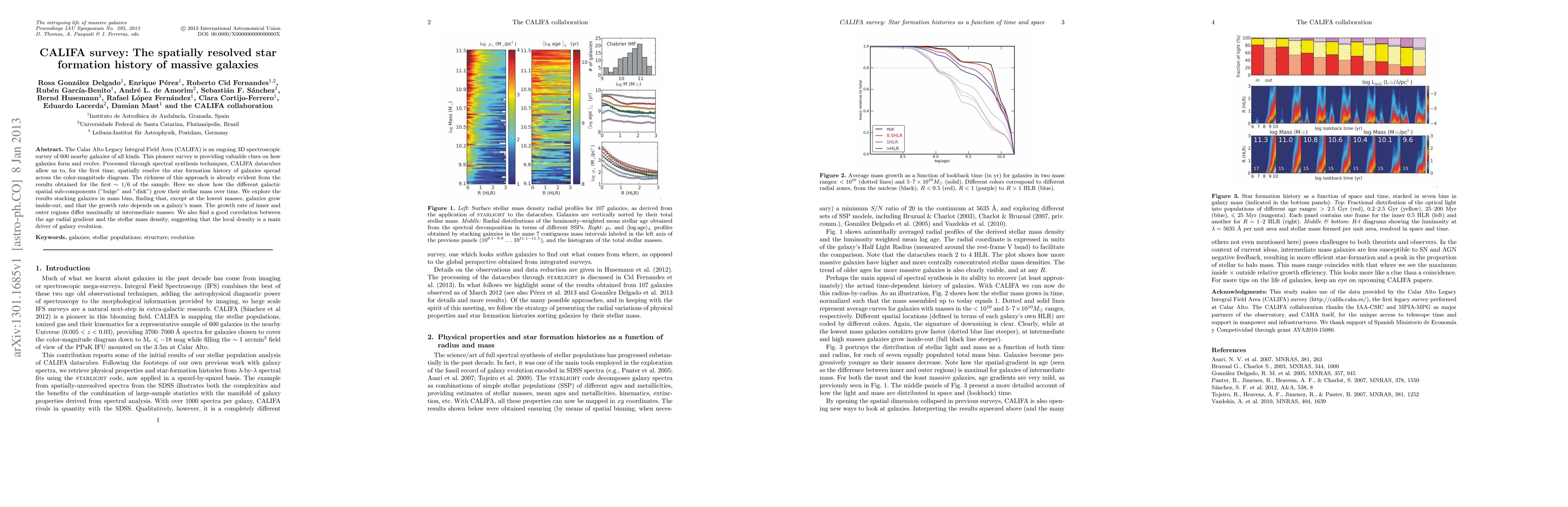 The CALIFA survey reveals the spatially resolved star formation history of massive galaxies, showing that galaxies grow inside-out, with growth rates varying by mass and differing most at intermediate masses. The study finds a correlation between age radial gradients and stellar mass density, indicating local density as a key driver of galaxy evolution.