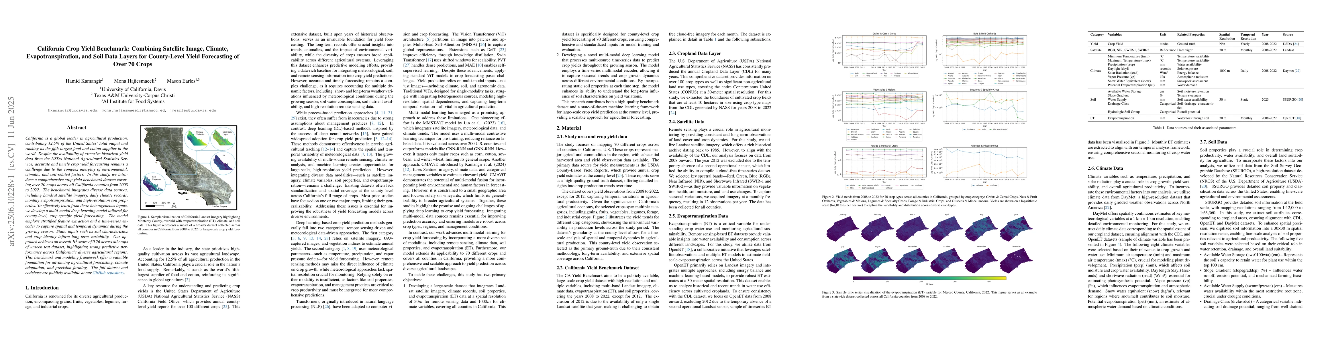 California is a global leader in agricultural production, contributing 12.5% of the United States total output and ranking as the fifth-largest food and cotton supplier in the world. Despite the availability of extensive historical yield data from the USDA National Agricultural Statistics Service, accurate and timely crop yield forecasting remains a challenge due to the complex interplay of environmental, climatic, and soil-related factors. In this study, we introduce a comprehensive crop yield benchmark dataset covering over 70 crops across all California counties from 2008 to 2022. The benchmark integrates diverse data sources, including Landsat satellite imagery, daily climate records, monthly evapotranspiration, and high-resolution soil properties. To effectively learn from these heterogeneous inputs, we develop a multi-modal deep learning model tailored for county-level, crop-specific yield forecasting. The model employs stratified feature extraction and a timeseries encoder to capture spatial and temporal dynamics during the growing season. Static inputs such as soil characteristics and crop identity inform long-term variability. Our approach achieves an overall R2 score of 0.76 across all crops of unseen test dataset, highlighting strong predictive performance across California diverse agricultural regions. This benchmark and modeling framework offer a valuable foundation for advancing agricultural forecasting, climate adaptation, and precision farming. The full dataset and codebase are publicly available at our GitHub repository.