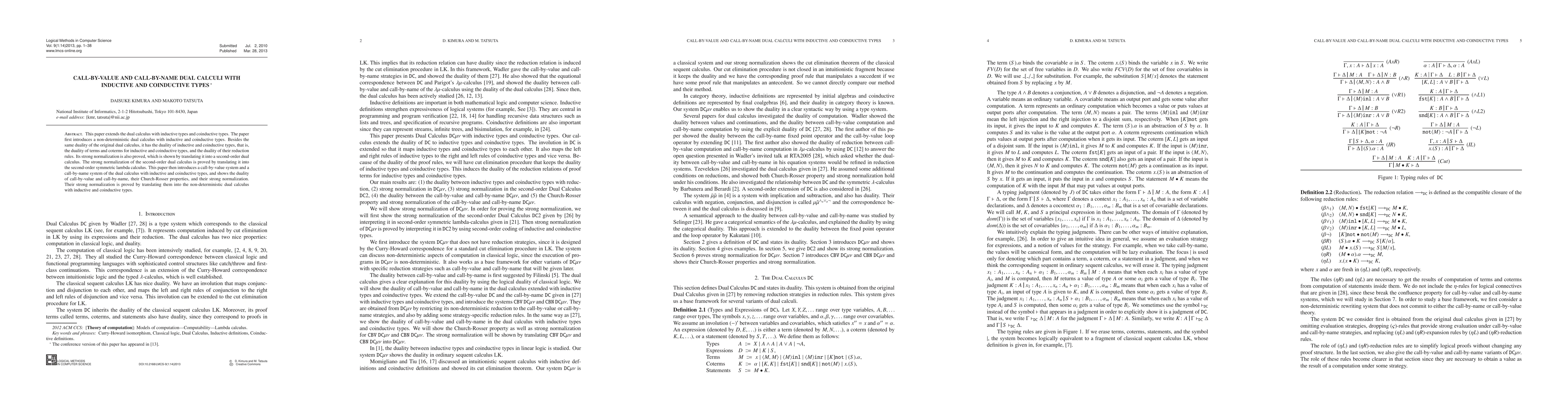 This paper extends a dual calculus to incorporate inductive and coinductive types, proving strong normalization through translation into a second-order dual calculus and demonstrating the duality, Church-Rosser properties, and strong normalization of both call-by-value and call-by-name systems within this framework.