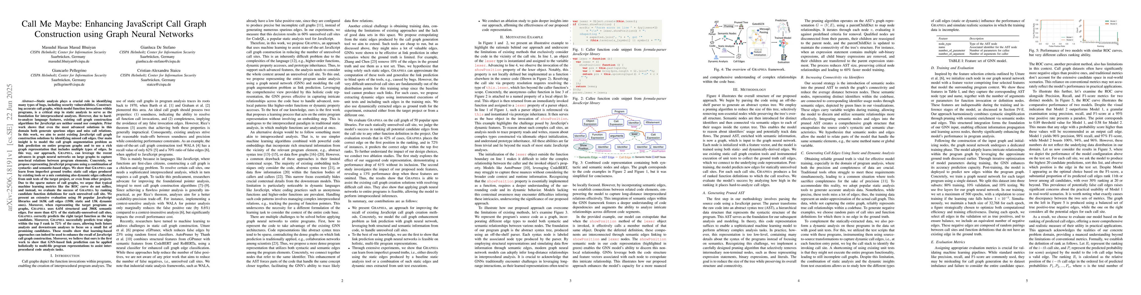 Static analysis plays a key role in finding bugs, including security issues. A critical step in static analysis is building accurate call graphs that model function calls in a program. However, due to hard-to-analyze language features, existing call graph construction algorithms for JavaScript are neither sound nor complete. Prior work shows that even advanced solutions produce false edges and miss valid ones. In this work, we assist these tools by identifying missed call edges. Our main idea is to frame the problem as link prediction on full program graphs, using a rich representation with multiple edge types. Our approach, GRAPHIA, leverages recent advances in graph neural networks to model non-local relationships between code elements. Concretely, we propose representing JavaScript programs using a combination of syntactic- and semantic-based edges. GRAPHIA can learn from imperfect labels, including static call edges from existing tools and dynamic edges from tests, either from the same or different projects. Because call graphs are sparse, standard machine learning metrics like ROC are not suitable. Instead, we evaluate GRAPHIA by ranking function definitions for each unresolved call site. We conduct a large-scale evaluation on 50 popular JavaScript libraries with 163K call edges (150K static and 13K dynamic). GRAPHIA builds program graphs with 6.6M structural and 386K semantic edges. It ranks the correct target as the top candidate in over 42% of unresolved cases and within the top 5 in 72% of cases, reducing the manual effort needed for analysis. Our results show that learning-based methods can improve the recall of JavaScript call graph construction. To our knowledge, this is the first work to apply GNN-based link prediction to full multi-file program graphs for interprocedural analysis.