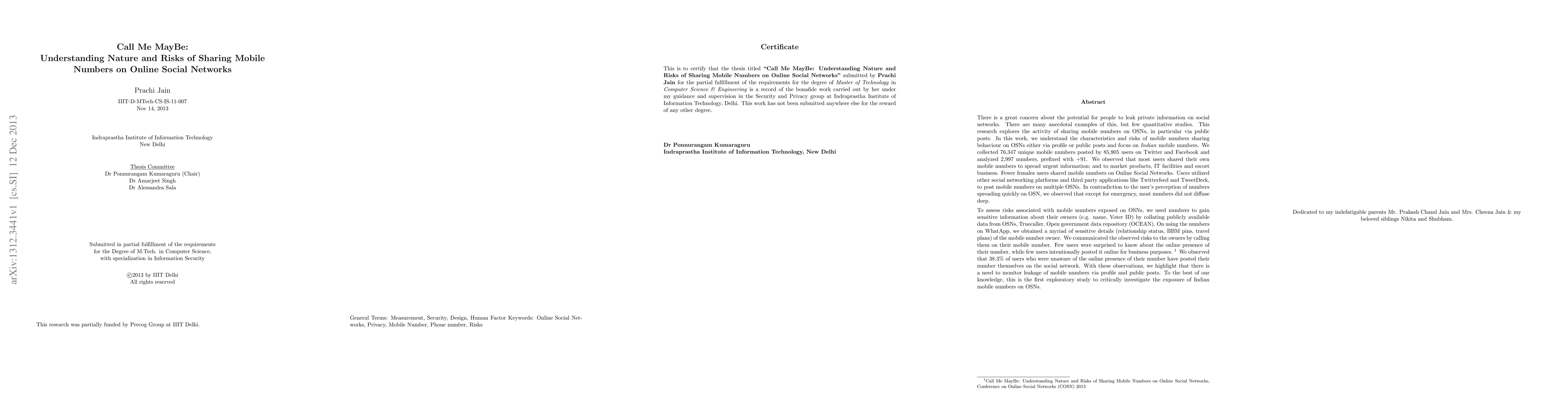 There is a great concern about the potential for people to leak private information on OSNs, but few quantitative studies on this. This research explores the activity of sharing mobile numbers on OSNs, via public profiles and posts. We attempt to understand the characteristics and risks of mobile numbers sharing behaviour on OSNs and focus on Indian mobile numbers. We collected 76,347 unique mobile numbers posted by 85905 users on Twitter and Facebook and analysed 2997 numbers, prefixed with +91. We observed, most users shared their own mobile numbers to spread urgent information; and to market products and escort business. Fewer female users shared mobile numbers on OSNs. Users utilized other OSN platforms and third party applications like Twitterfeed, to post mobile numbers on multiple OSNs. In contrast to the user's perception of numbers spreading quickly on OSN, we observed that except for emergency, most numbers did not diffuse deep. To assess risks associated with mobile numbers exposed on OSNs, we used numbers to gain sensitive information about their owners (e.g. name, Voter ID) by collating publicly available data from OSNs, Truecaller, OCEAN. On using the numbers on WhatApp, we obtained a myriad of sensitive details (relationship status, BBM pins) of the number owner. We communicated the observed risks to the owners by calling. Few users were surprised to know about the online presence of their number, while a few others intentionally posted it online for business purposes. We observed, 38.3% of users who were unaware of the online presence of their number have posted their number themselves on the social network. With these observations, we highlight that there is a need to monitor leakage of mobile numbers via profile and public posts. To the best of our knowledge, this is the first exploratory study to critically investigate the exposure of Indian mobile numbers on OSNs.