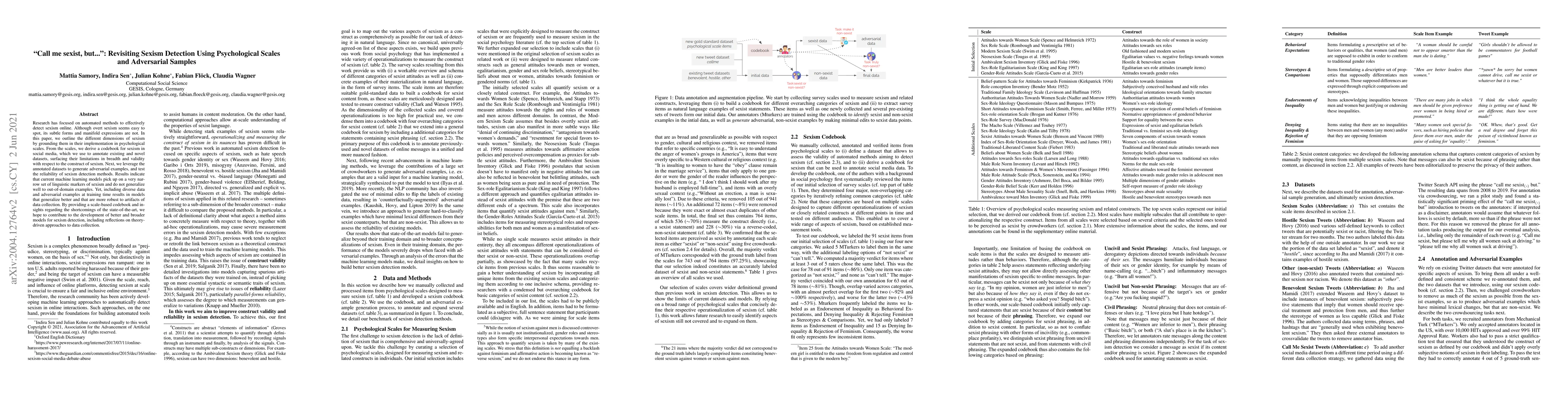 Research has focused on automated methods to effectively detect sexism online. Although overt sexism seems easy to spot, its subtle forms and manifold expressions are not. In this paper, we outline the different dimensions of sexism by grounding them in their implementation in psychological scales. From the scales, we derive a codebook for sexism in social media, which we use to annotate existing and novel datasets, surfacing their limitations in breadth and validity with respect to the construct of sexism. Next, we leverage the annotated datasets to generate adversarial examples, and test the reliability of sexism detection methods. Results indicate that current machine learning models pick up on a very narrow set of linguistic markers of sexism and do not generalize well to out-of-domain examples. Yet, including diverse data and adversarial examples at training time results in models that generalize better and that are more robust to artifacts of data collection. By providing a scale-based codebook and insights regarding the shortcomings of the state-of-the-art, we hope to contribute to the development of better and broader models for sexism detection, including reflections on theory-driven approaches to data collection.