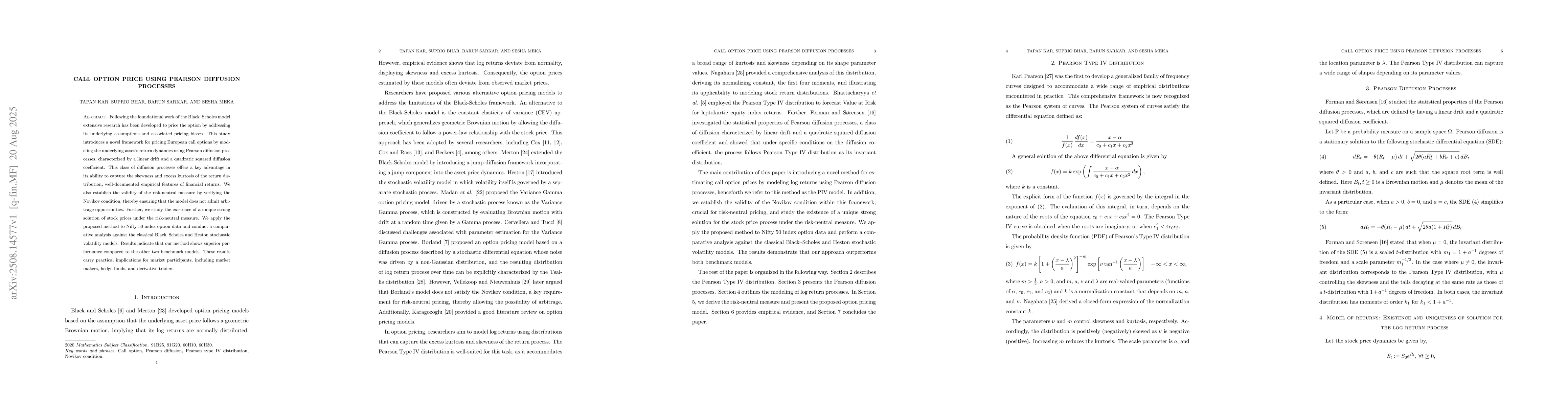 The research proposes a novel method for estimating call option prices by modeling log return dynamics using Pearson diffusion processes, which capture skewness and excess kurtosis. The study verifies the Novikov condition to ensure the model does not admit arbitrage opportunities and establishes the existence of a unique strong solution for stock prices under the risk-neutral measure.
