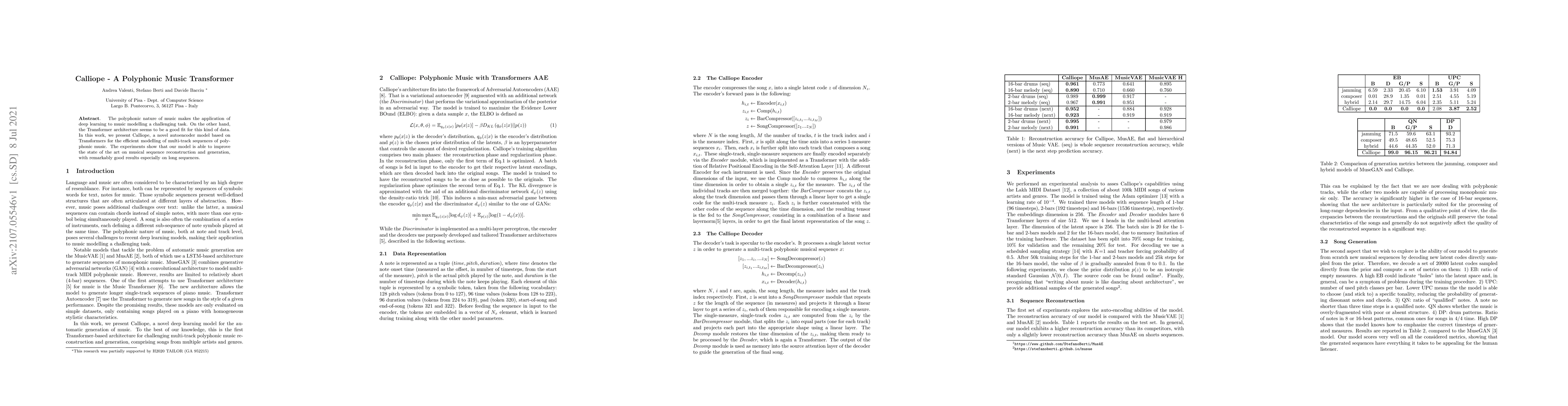Calliope is a Transformer-based autoencoder model designed for efficient modelling of polyphonic music sequences. It demonstrates state-of-the-art performance in musical sequence reconstruction and generation, particularly excelling with long sequences.